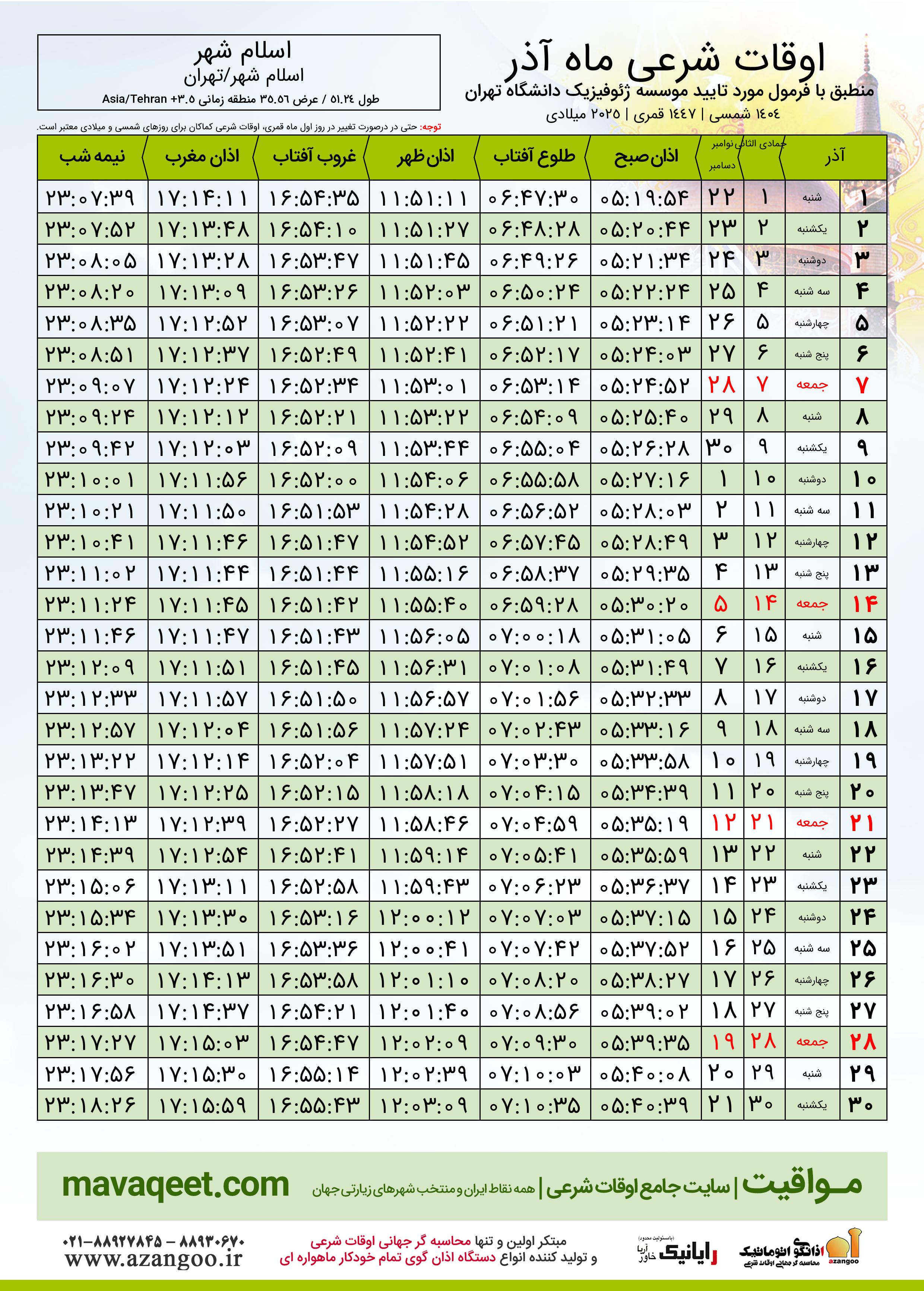 اوقات شرعی آذر ١٤٠٤ شمسی شهر اسلام شهر