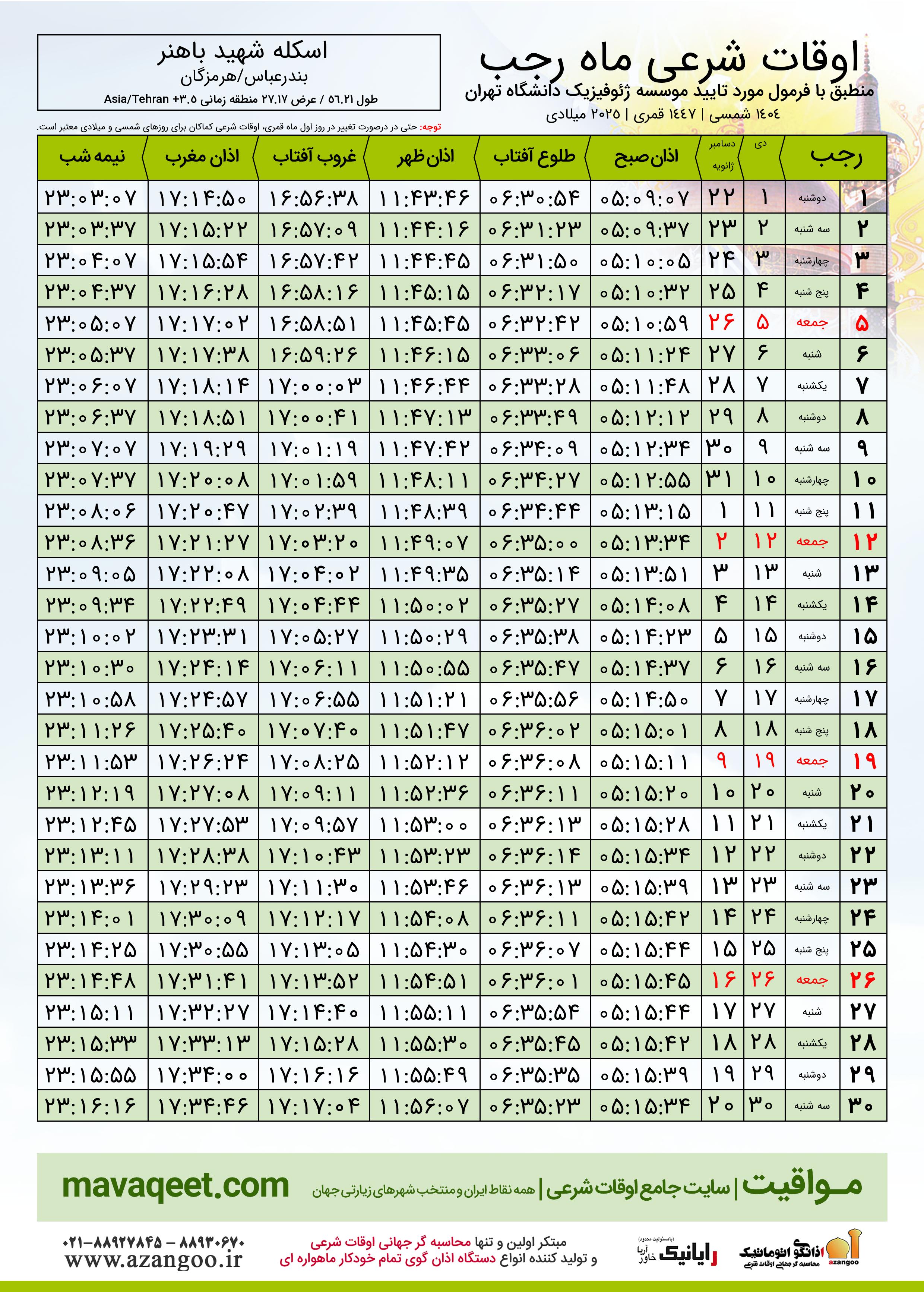 جدول اوقات شرعی رجب ١٤٤٧ قمری شهر اسکله شهید باهنر