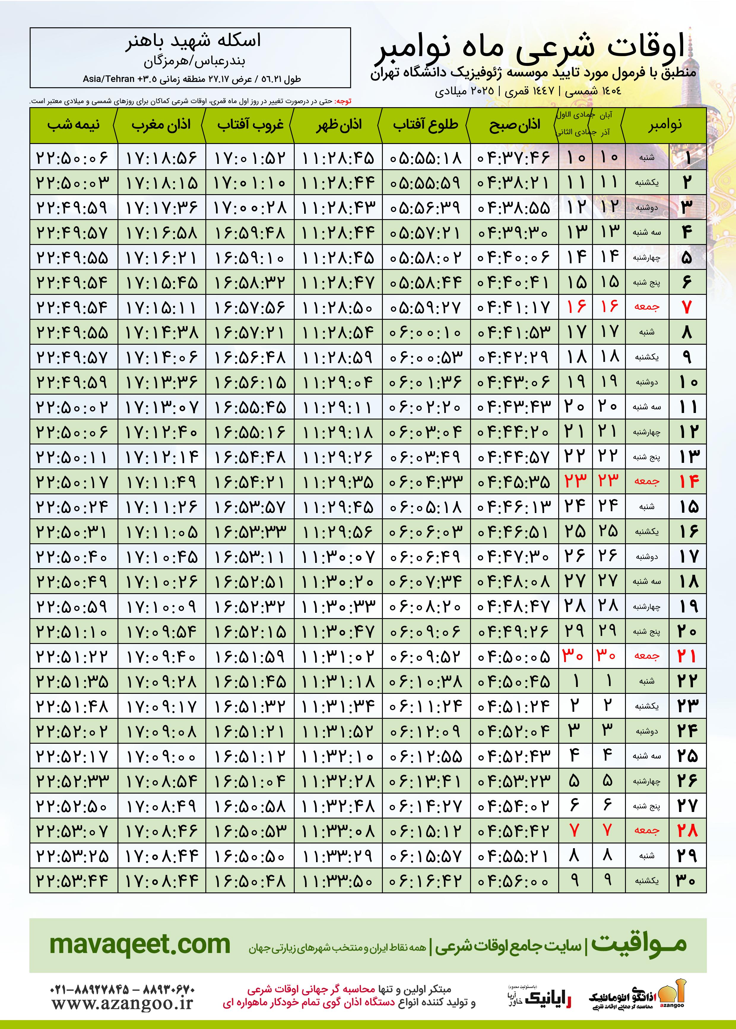 دانلود اوقات شرعی نوامبر ٢٠٢٥ شهر اسکله شهید باهنر