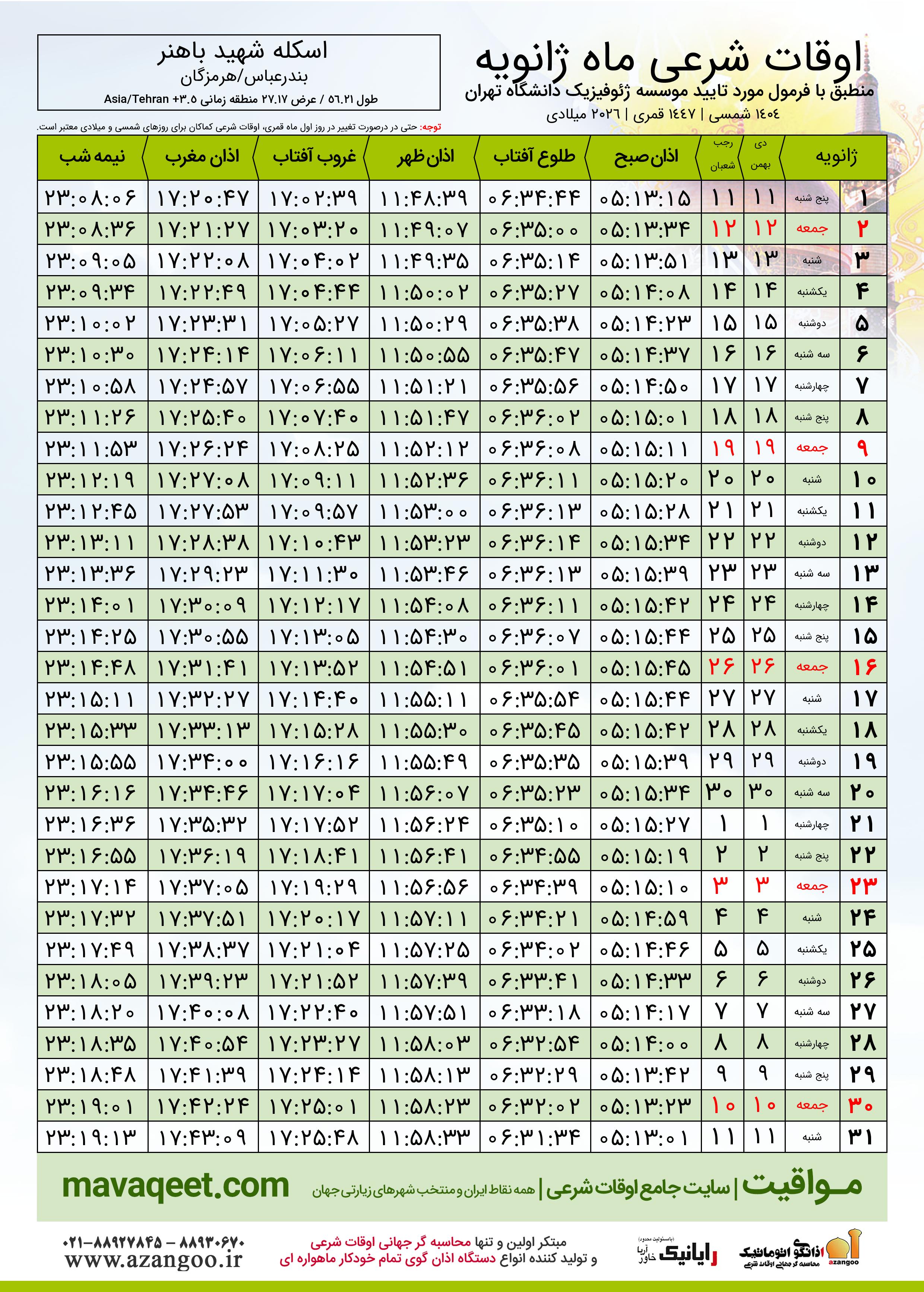 دانلود اوقات شرعی ژانویه ٢٠٢٦ شهر اسکله شهید باهنر