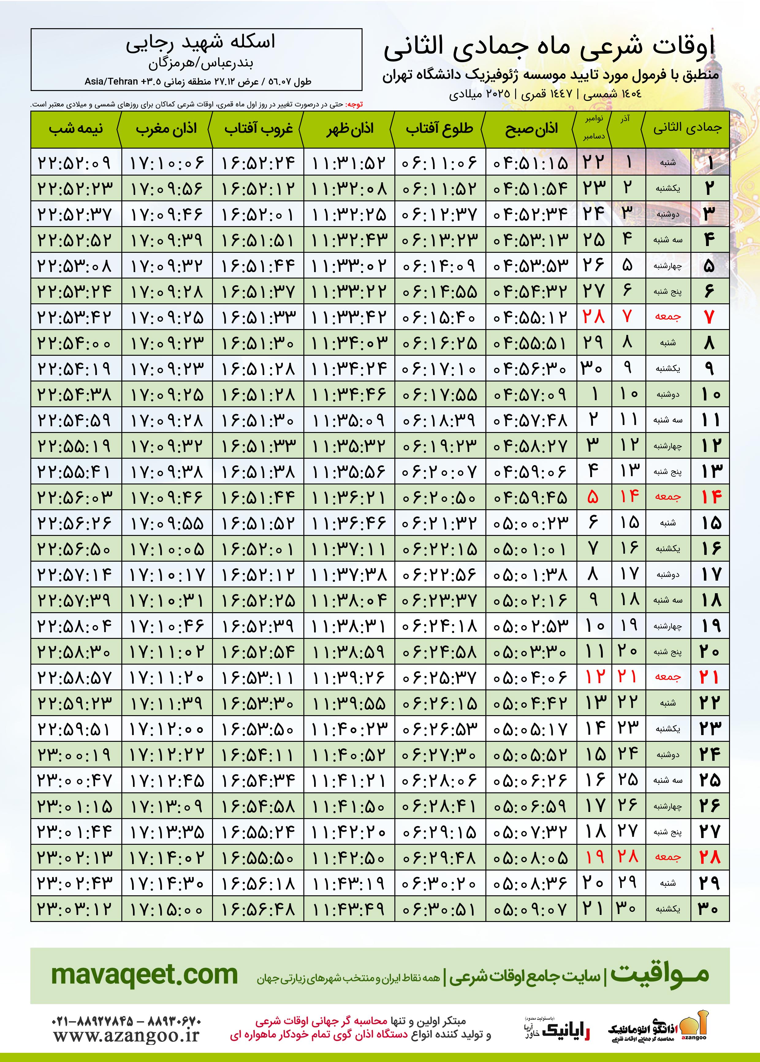 جدول اوقات شرعی جمادی الثانی ١٤٤٧ قمری شهر اسکله شهید رجایی
