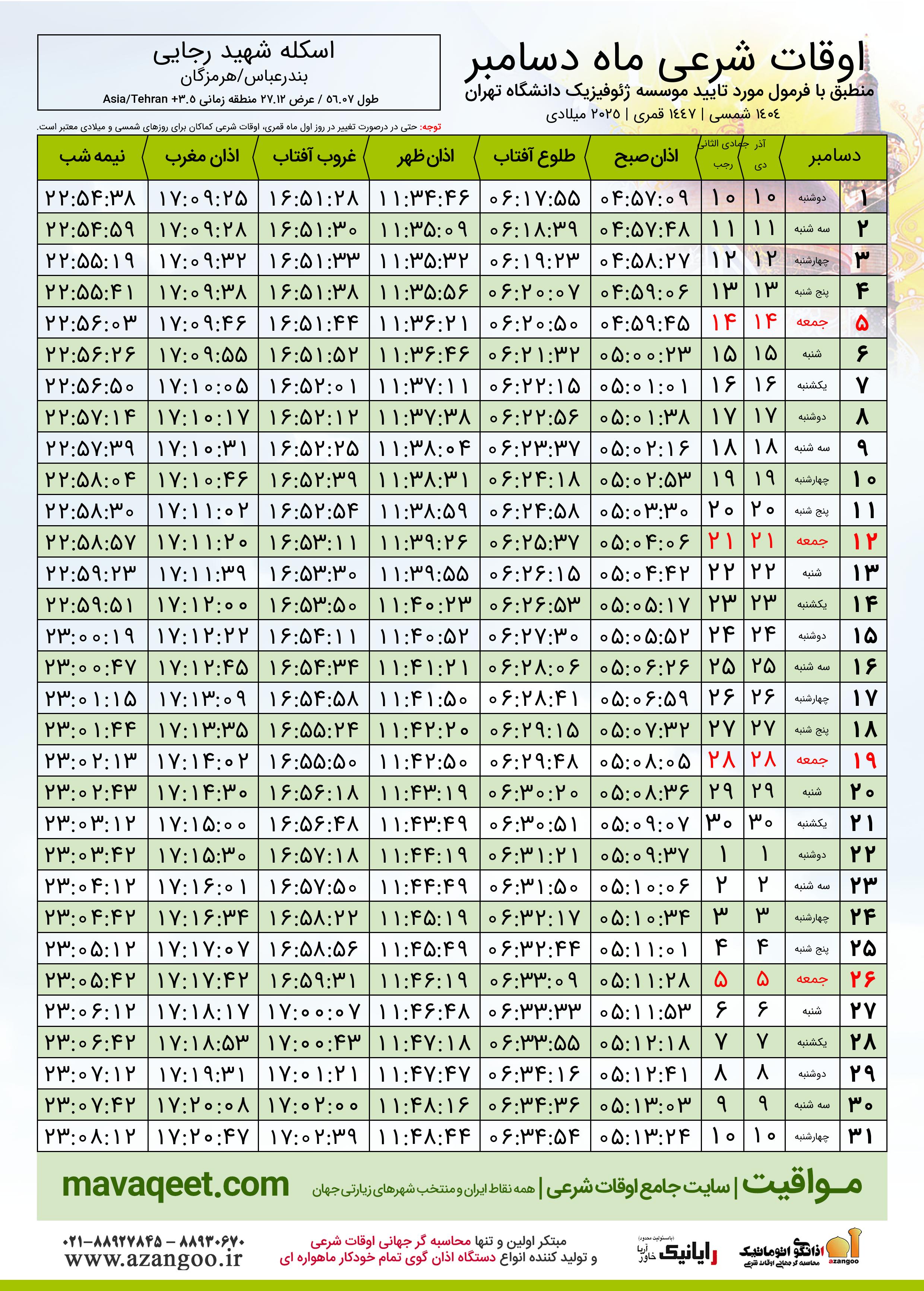 جدول اوقات شرعی دسامبر ٢٠٢٥ میلادی شهر اسکله شهید رجایی