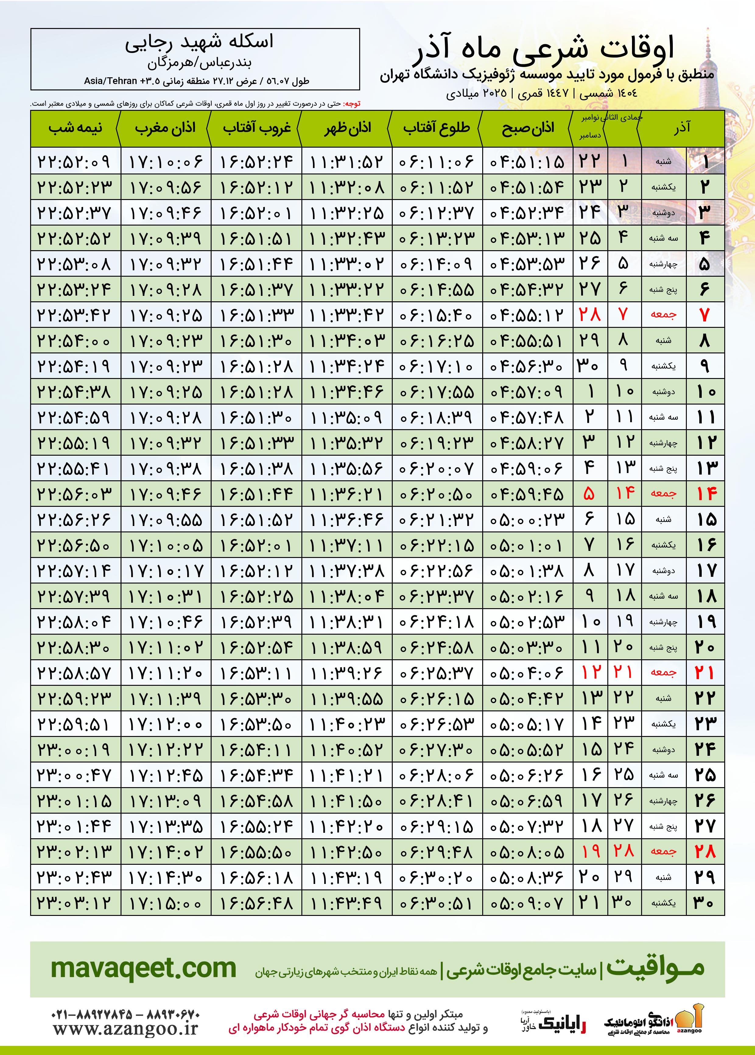 اوقات شرعی آذر ١٤٠٤ شمسی شهر اسکله شهید رجایی