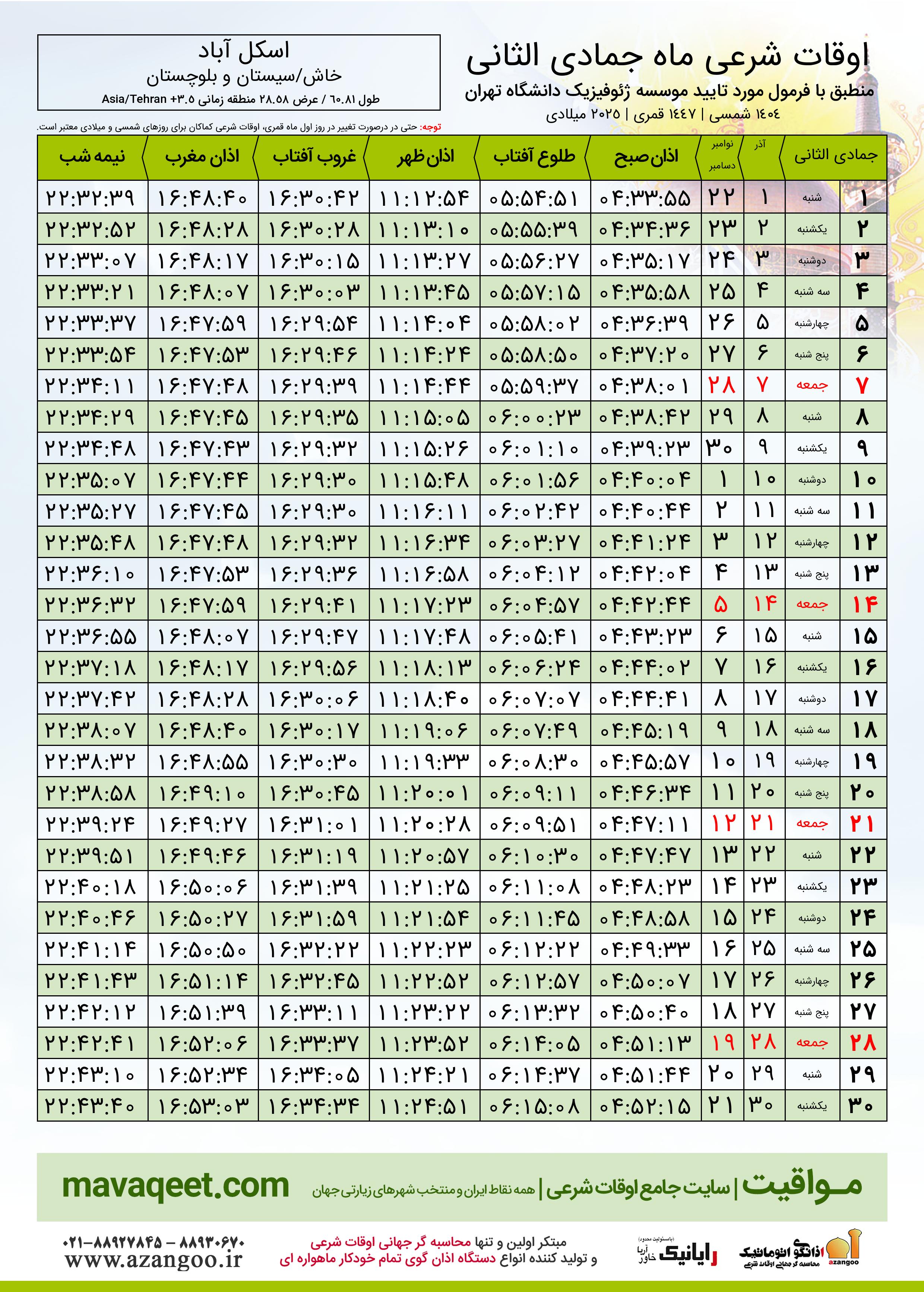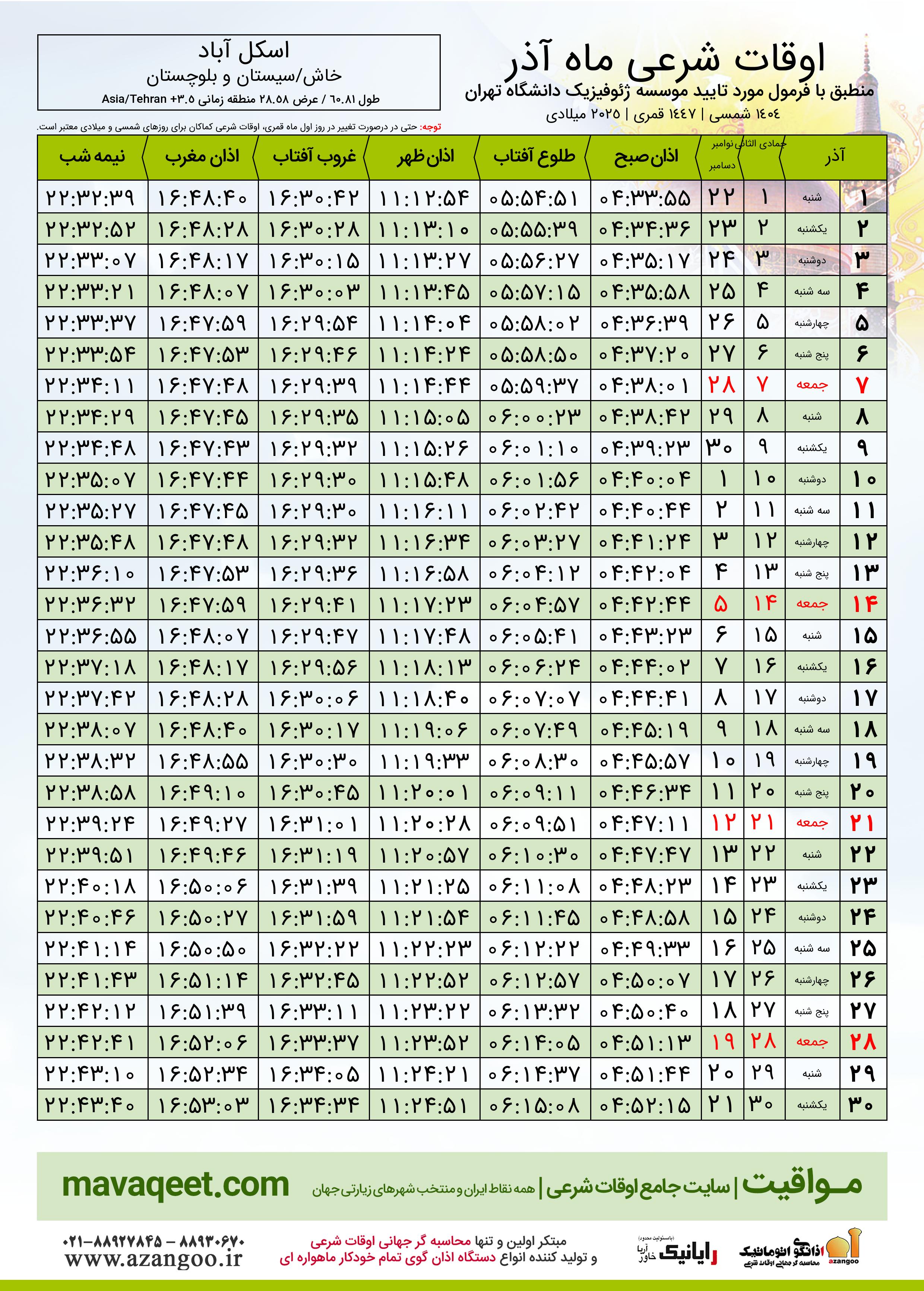 جدول اوقات شرعی آذر ١٤٠٤ شمسی شهر اسکل آباد