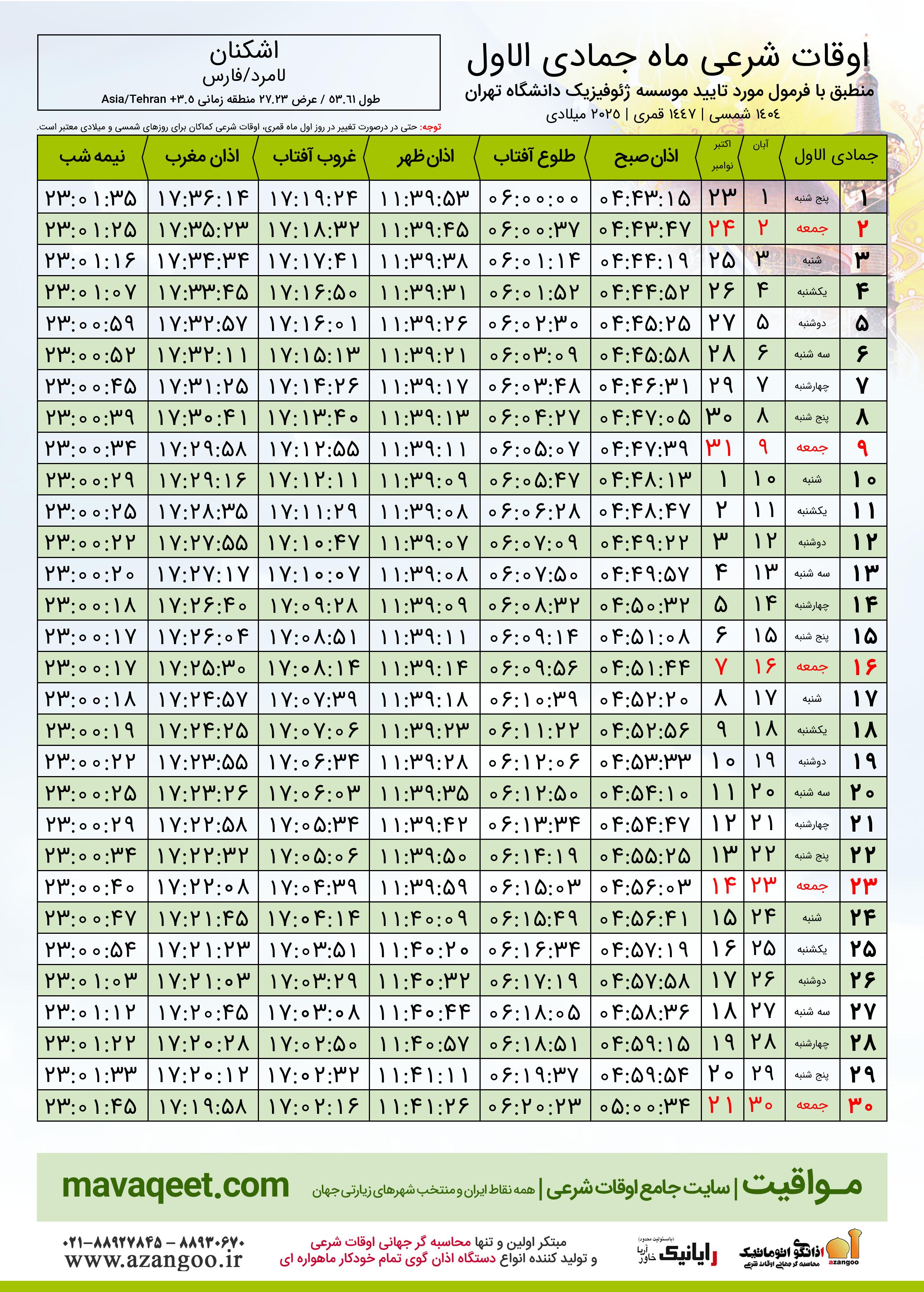 اوقات شرعی ماه جمادی الاول ١٤٤٧ هـ.ق شهر اشکنان بر