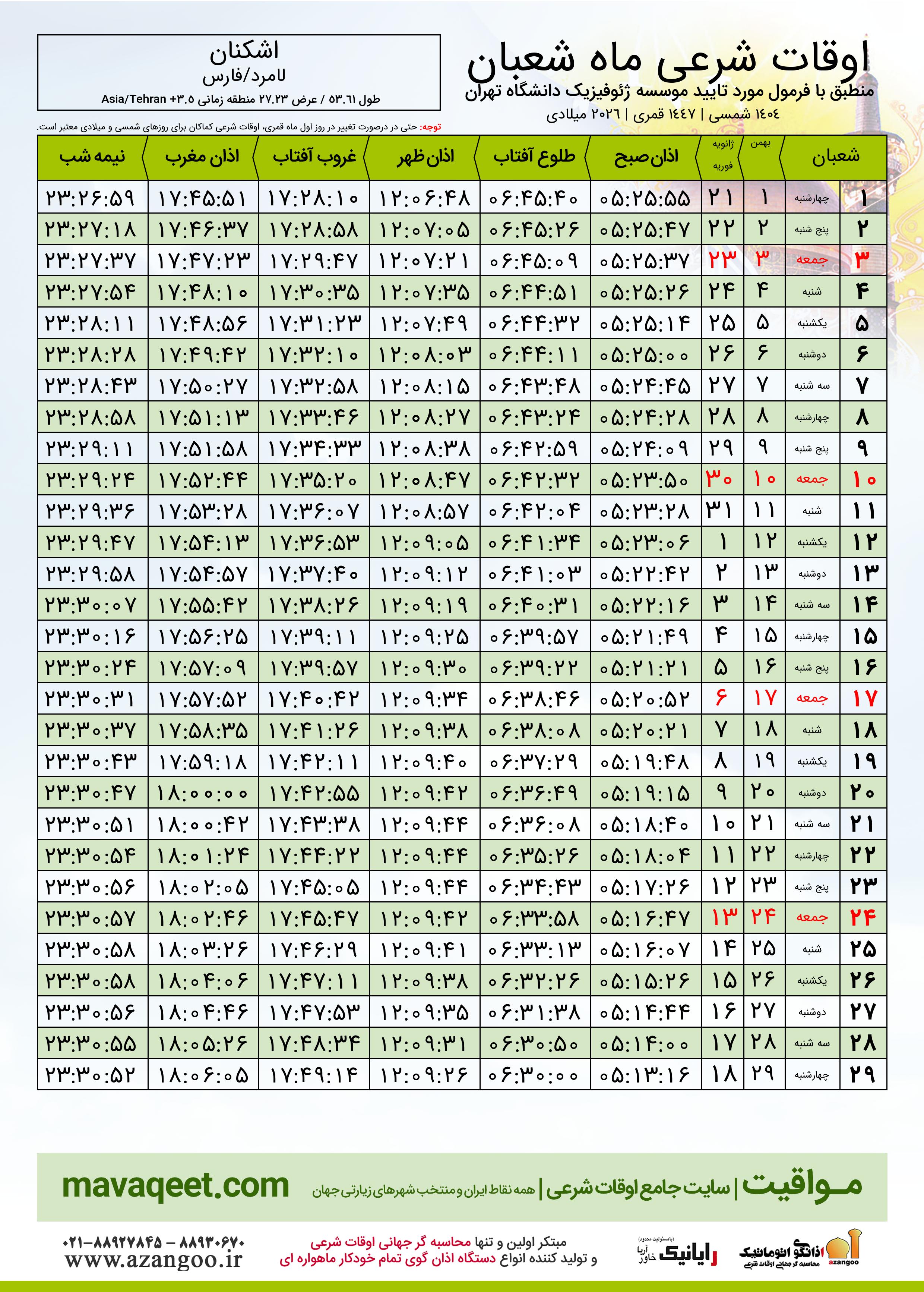اوقات شرعی شعبان ١٤٤٧ شهر اشکنان + دانلود