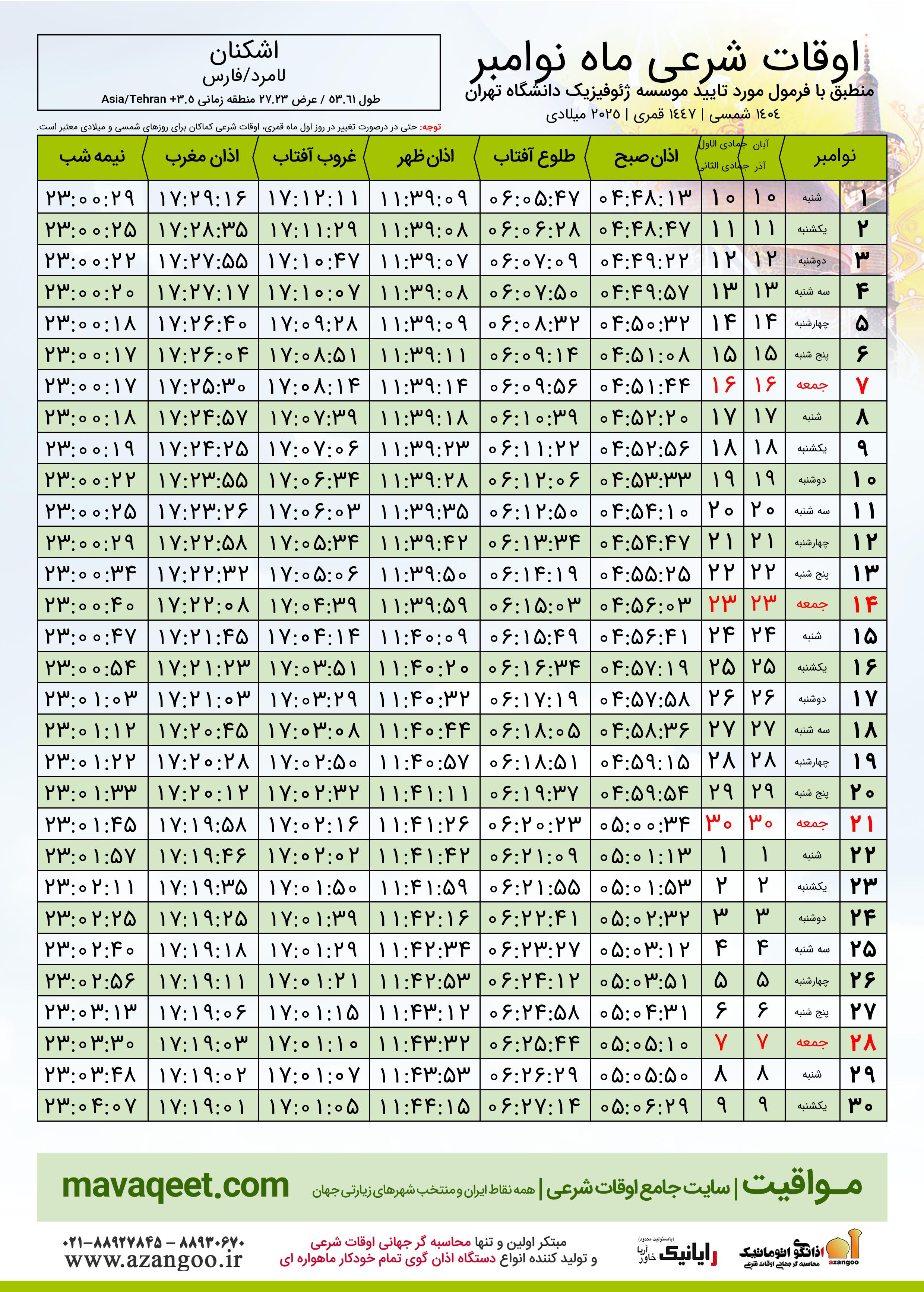 دانلود اوقات شرعی ماه رمضان ٠٤ - ١٤٠٤ شمسی | ٢٠٢٦ میلادی | ١٤٤٧ قمری شهر اشکنان