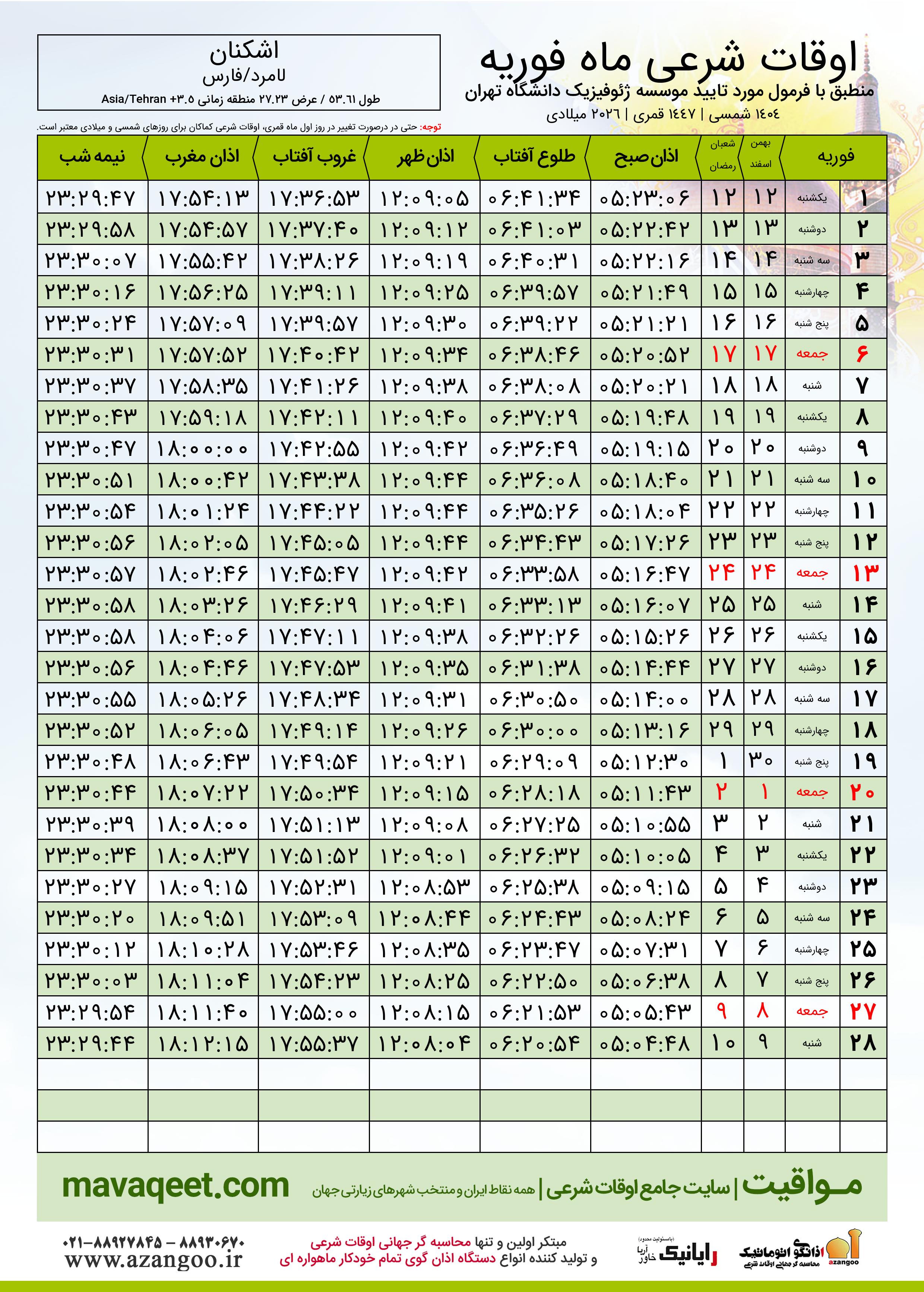 دانلود اوقات شرعی فوریه ٢٠٢٦ شهر اشکنان