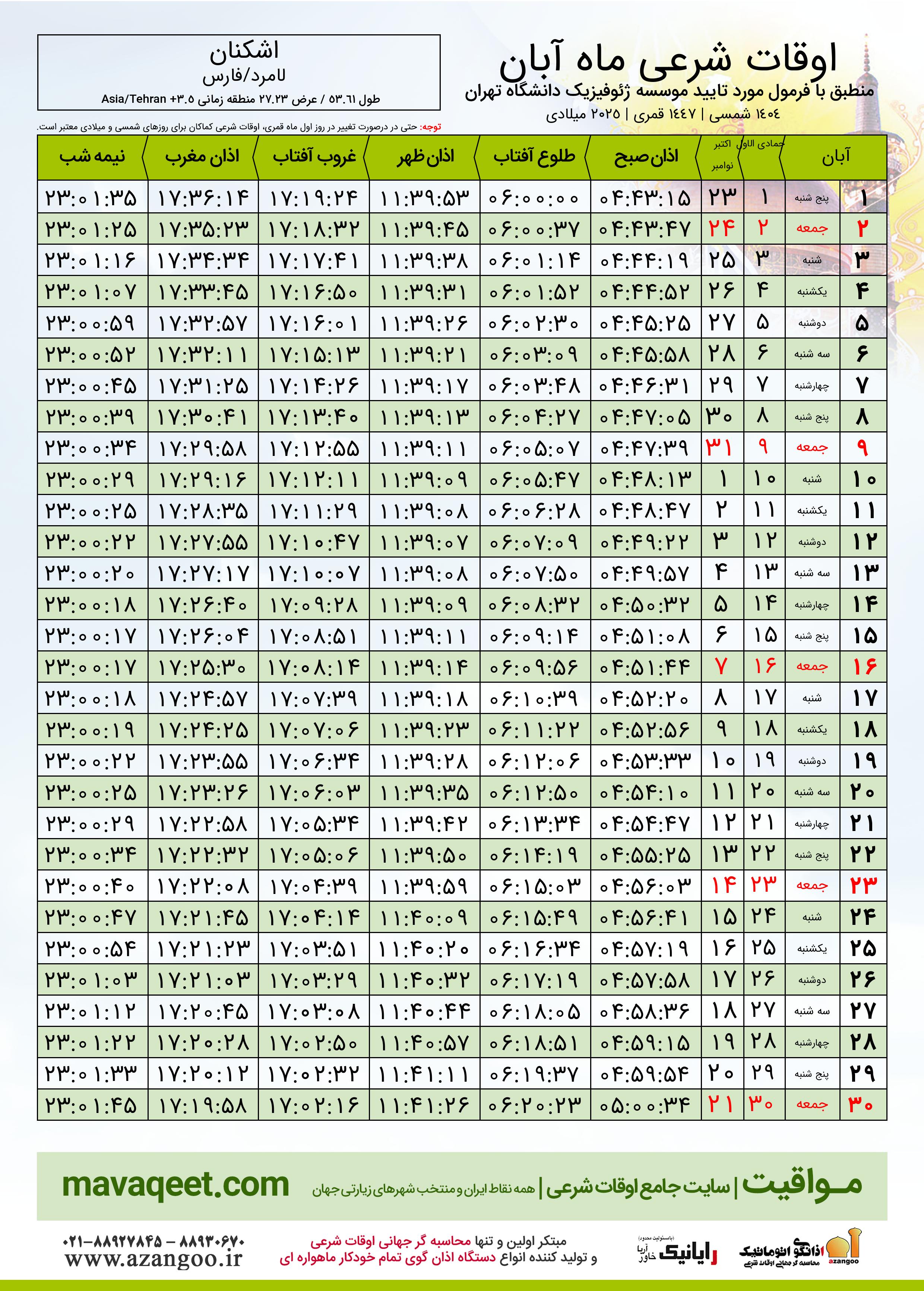 جدول اوقات شرعی آبان ١٤٠٤ شمسی شهر اشکنان