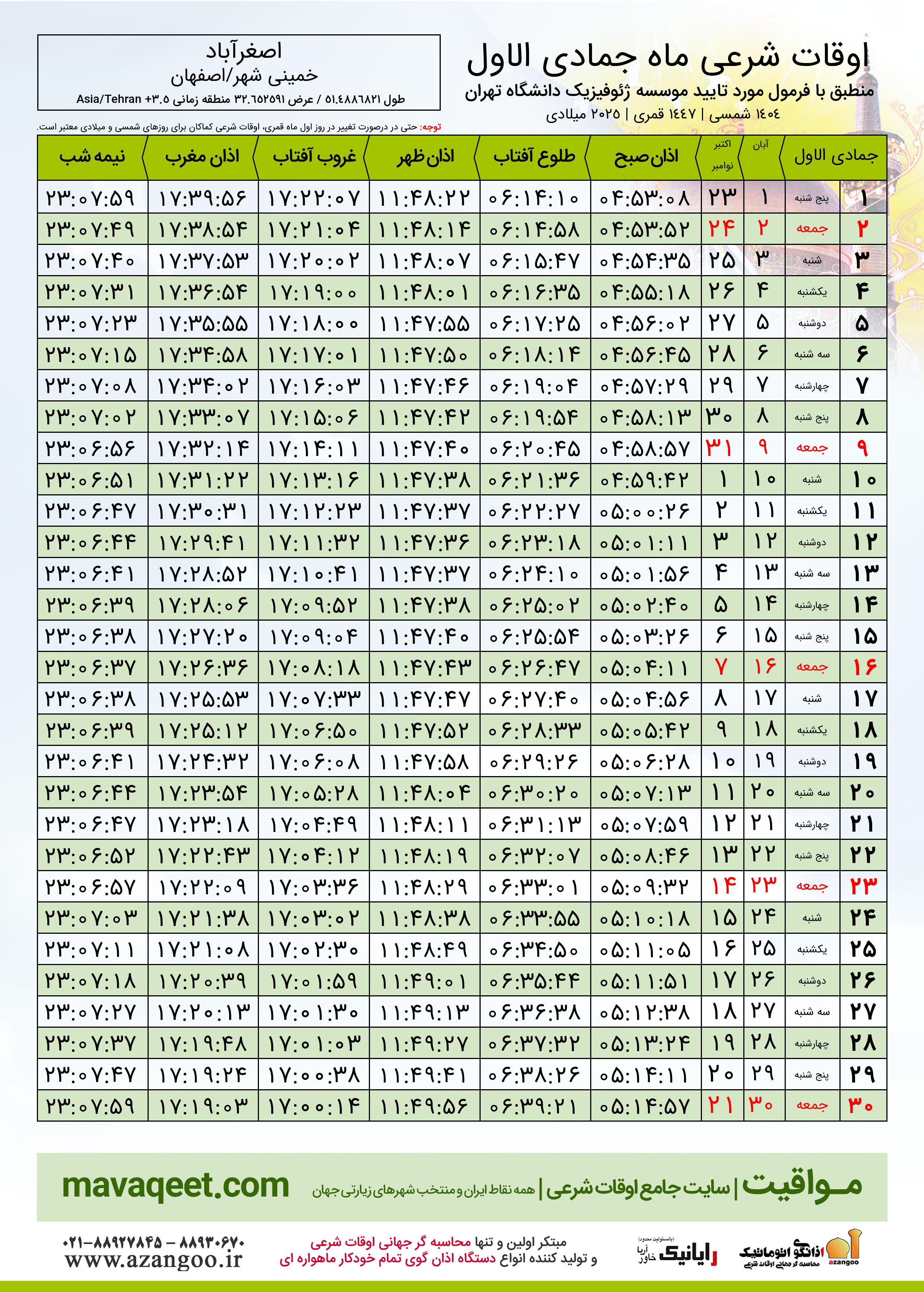 جدول اوقات شرعی جمادی الاول ١٤٤٧ قمری شهر اصغرآباد