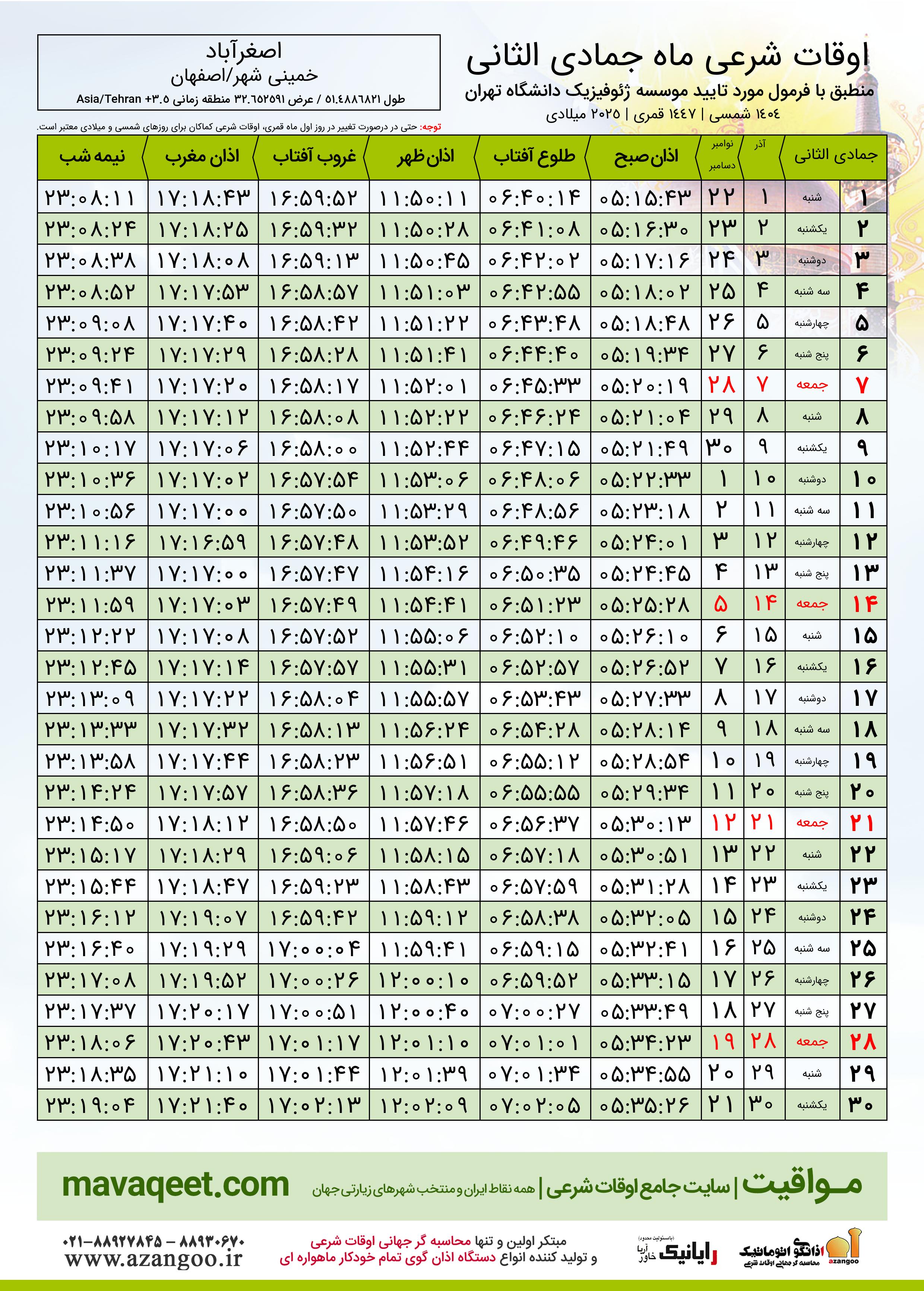 جدول اوقات شرعی جمادی الثانی ١٤٤٧ قمری شهر اصغرآباد