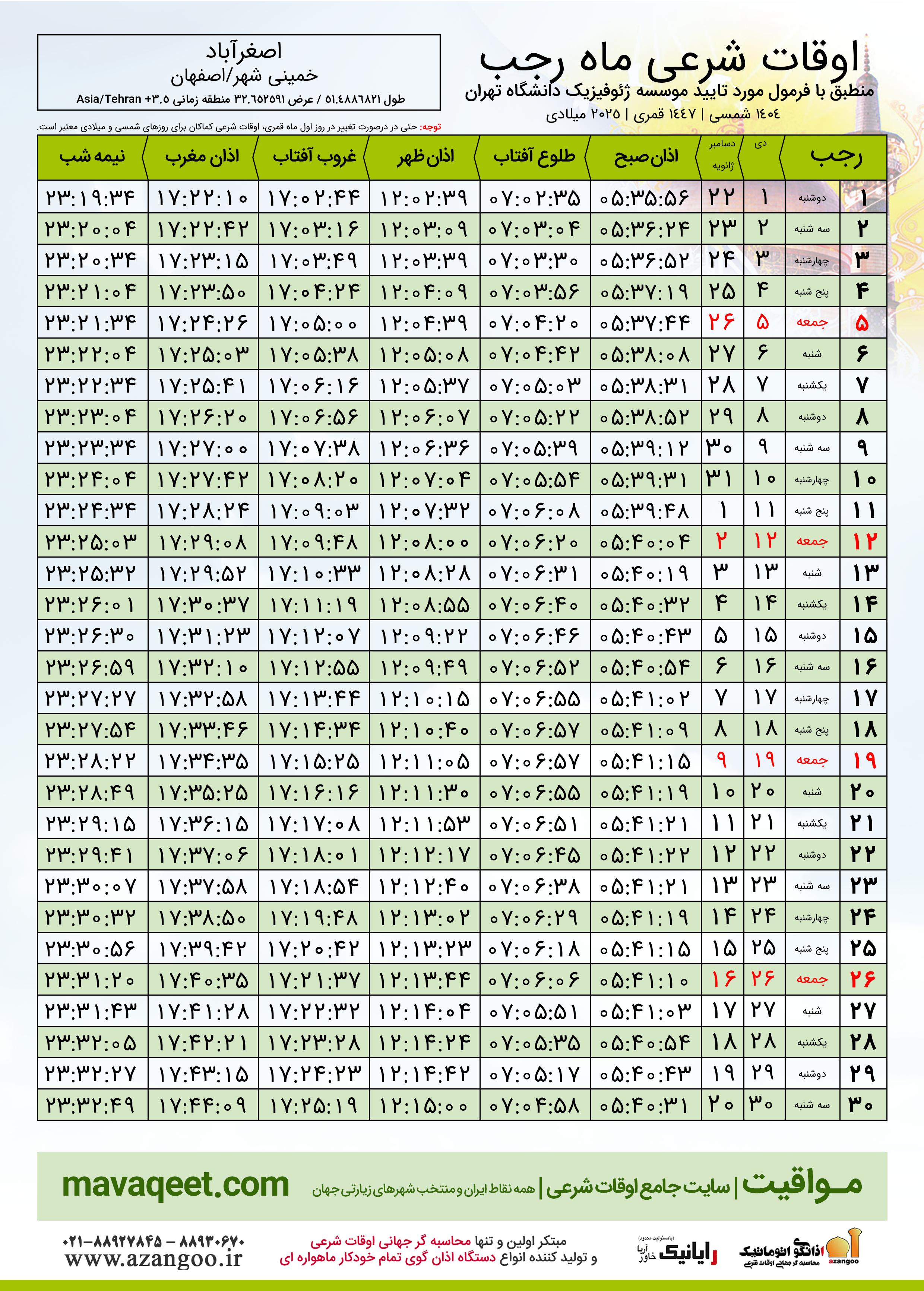 اوقات شرعی رجب ١٤٤٧ قمری شهر اصغرآباد