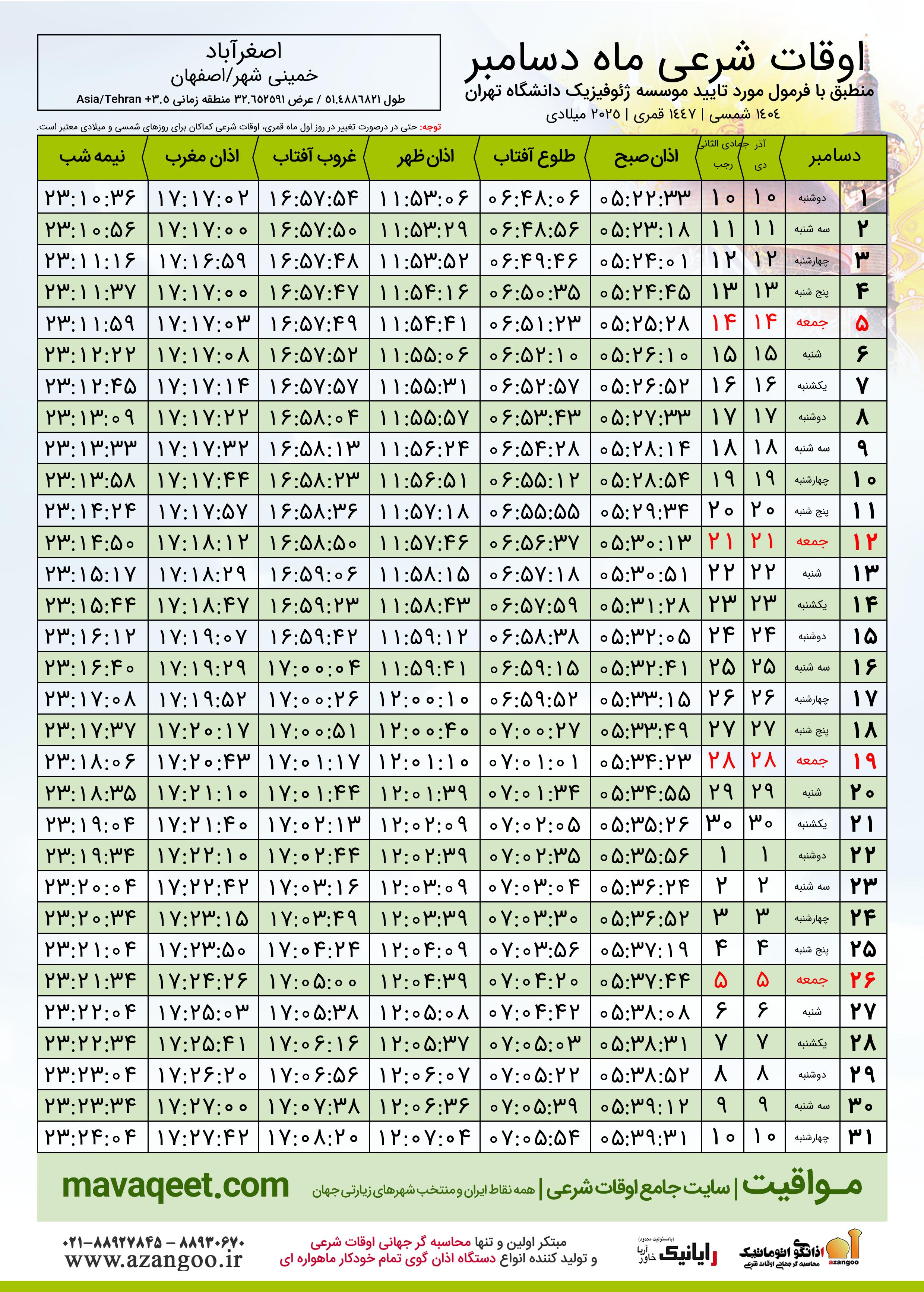 اوقات شرعی دسامبر ٢٠٢٥ شهر اصغرآباد + دانلود