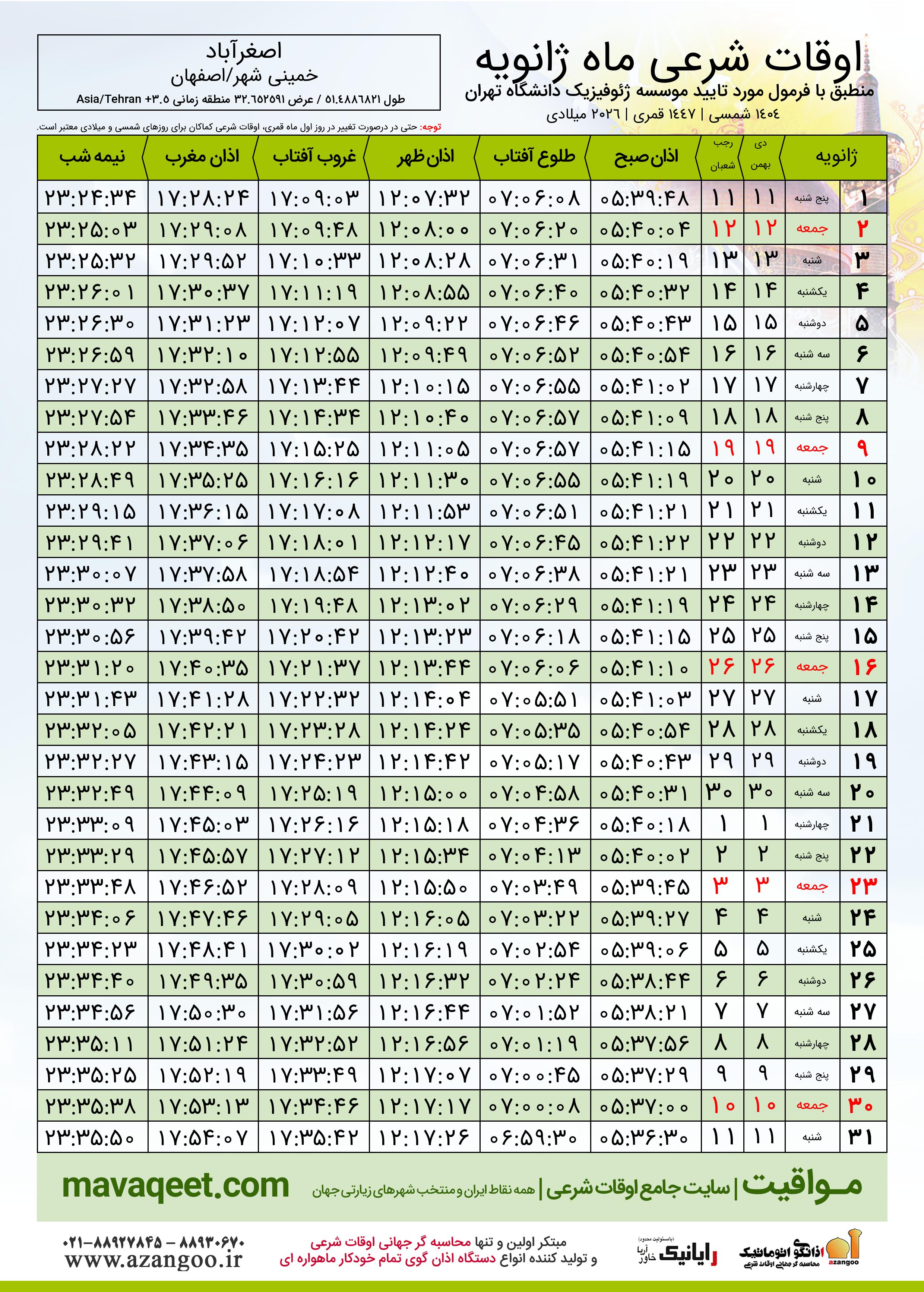 دانلود اوقات شرعی ژانویه ٢٠٢٦ شهر اصغرآباد
