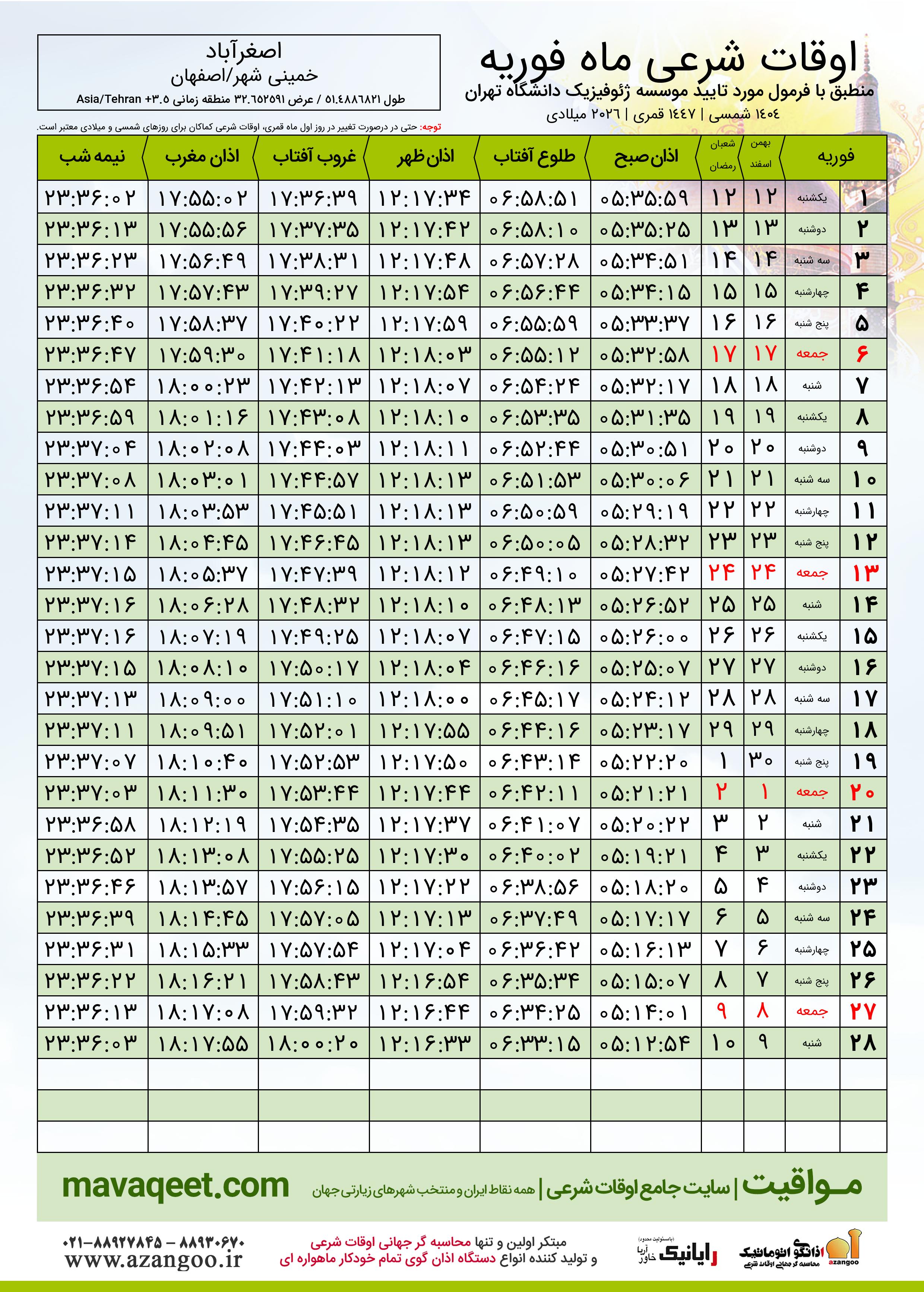 دانلود اوقات شرعی ماه رمضان ٠٤ - ١٤٠٤ شمسی | ٢٠٢٦ میلادی | ١٤٤٧ قمری شهر اصغرآباد