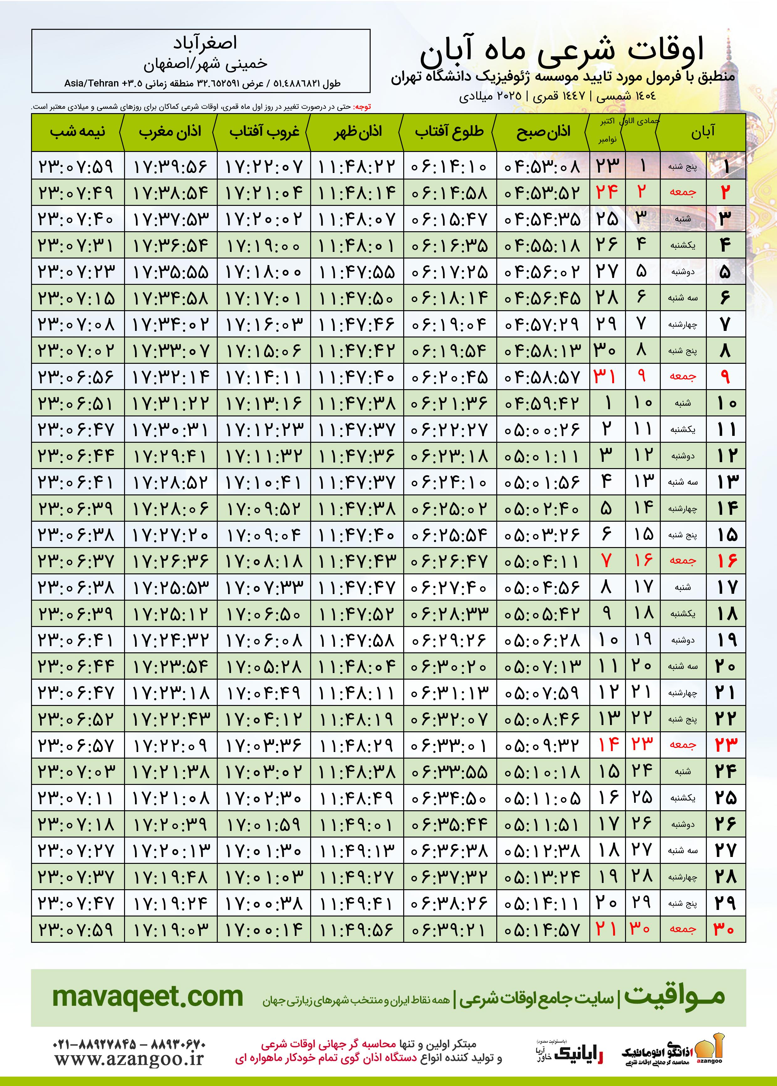 جدول اوقات شرعی آبان ١٤٠٤ شمسی شهر اصغرآباد