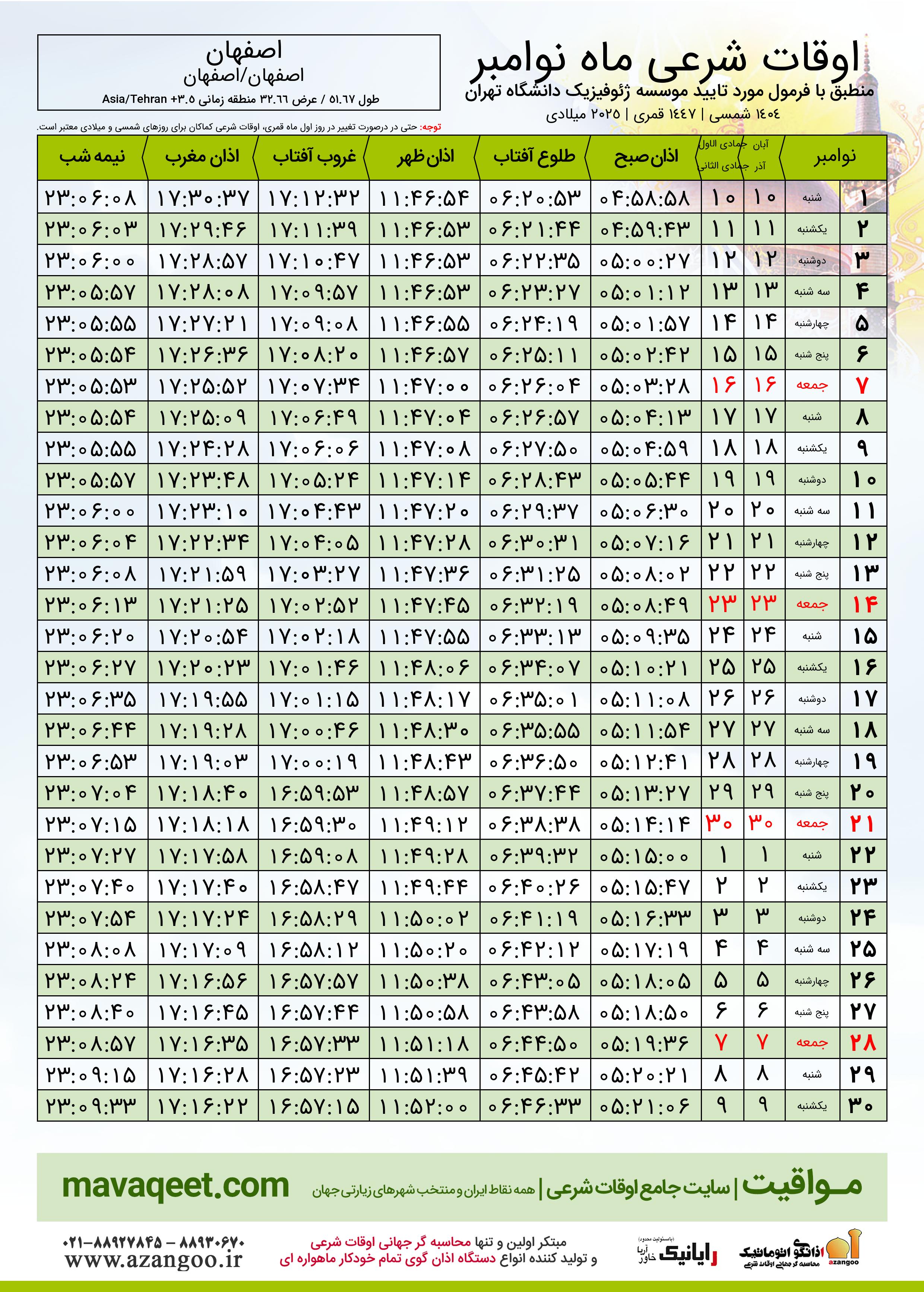 اوقات شرعی نوامبر ٢٠٢٥ میلادی شهر اصفهان