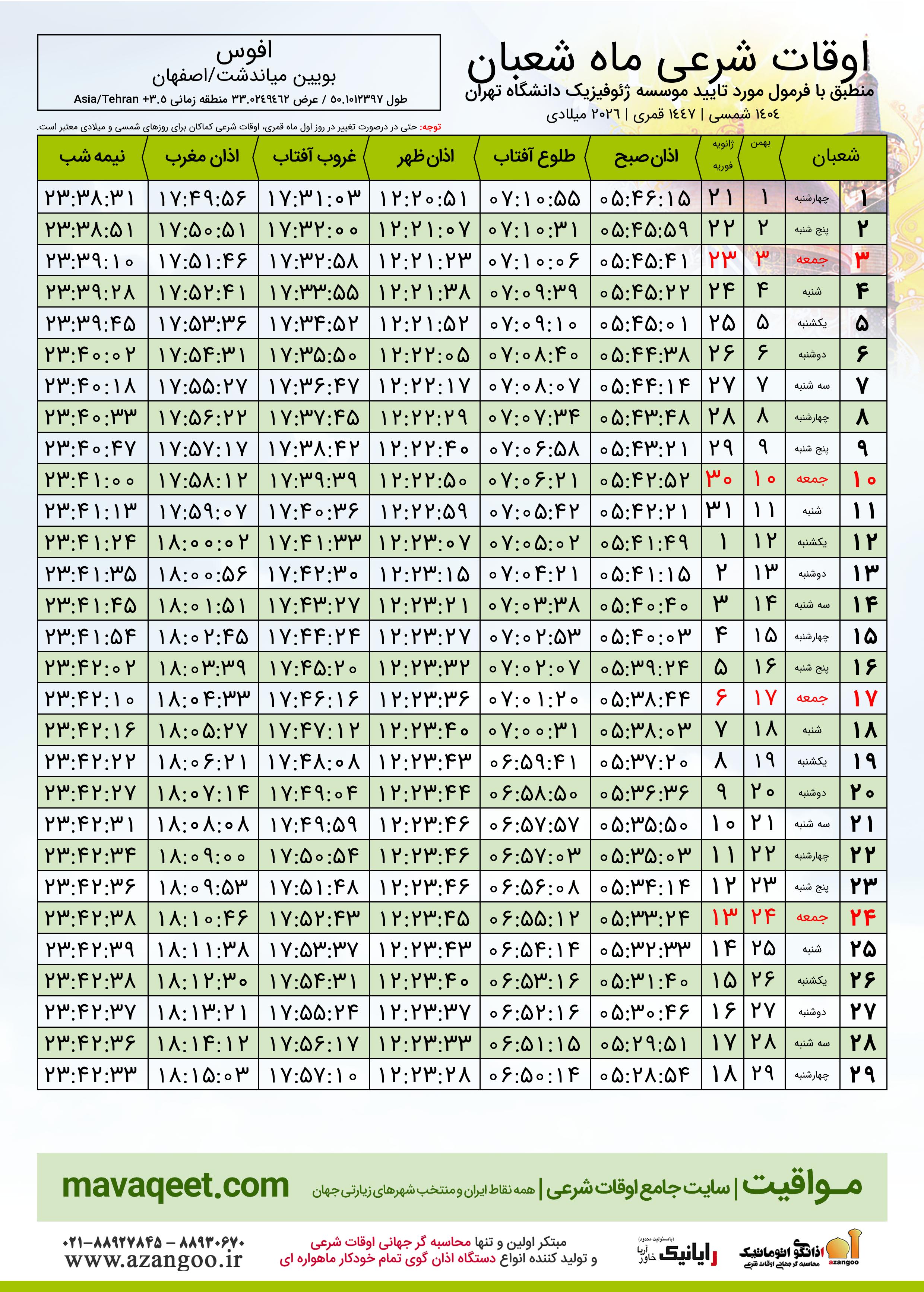 جدول اوقات شرعی شعبان ١٤٤٧ قمری شهر افوس