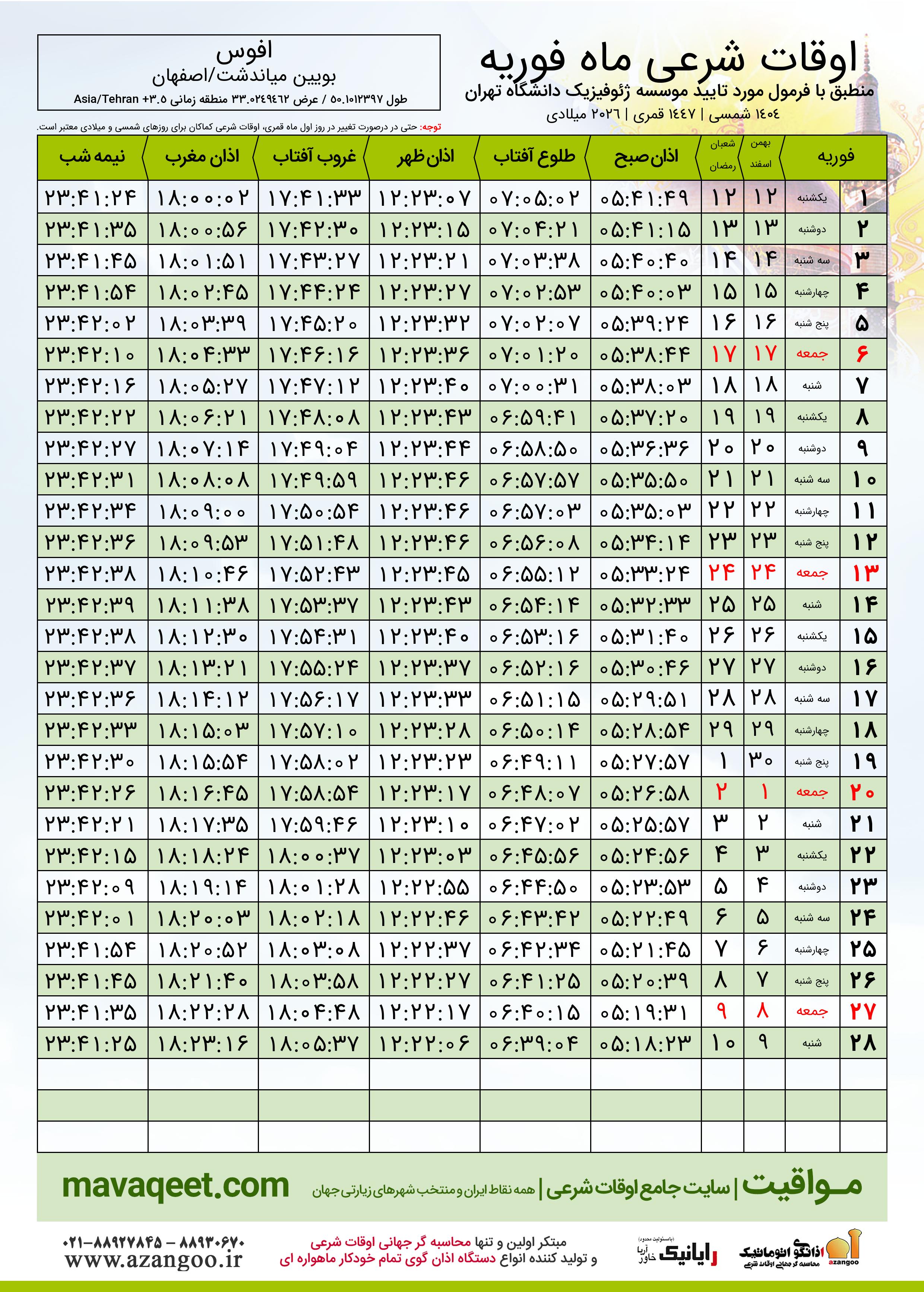 دانلود اوقات شرعی فوریه ٢٠٢٦ شهر افوس