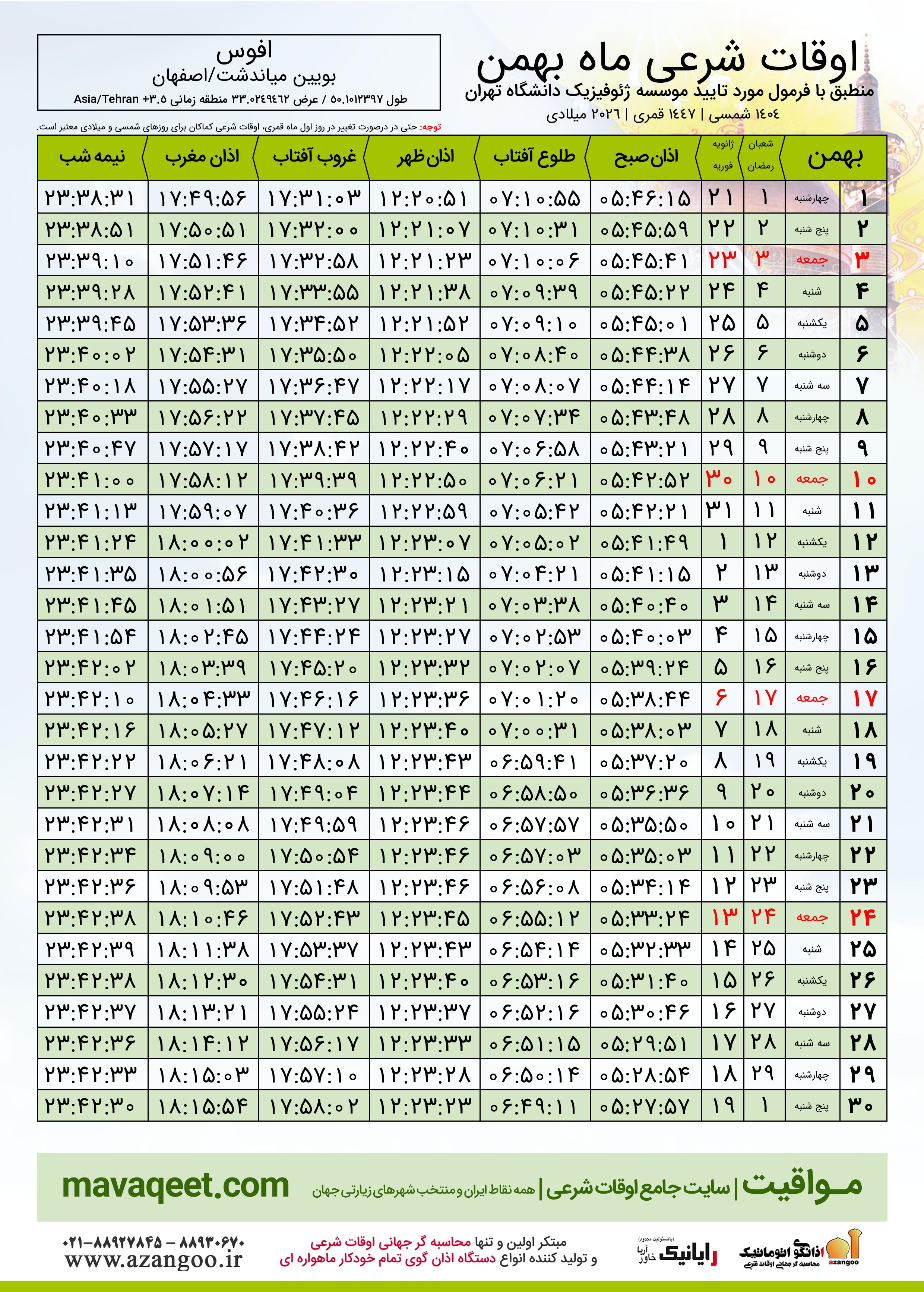 اوقات شرعی بهمن ١٤٠٤ شمسی شهر افوس