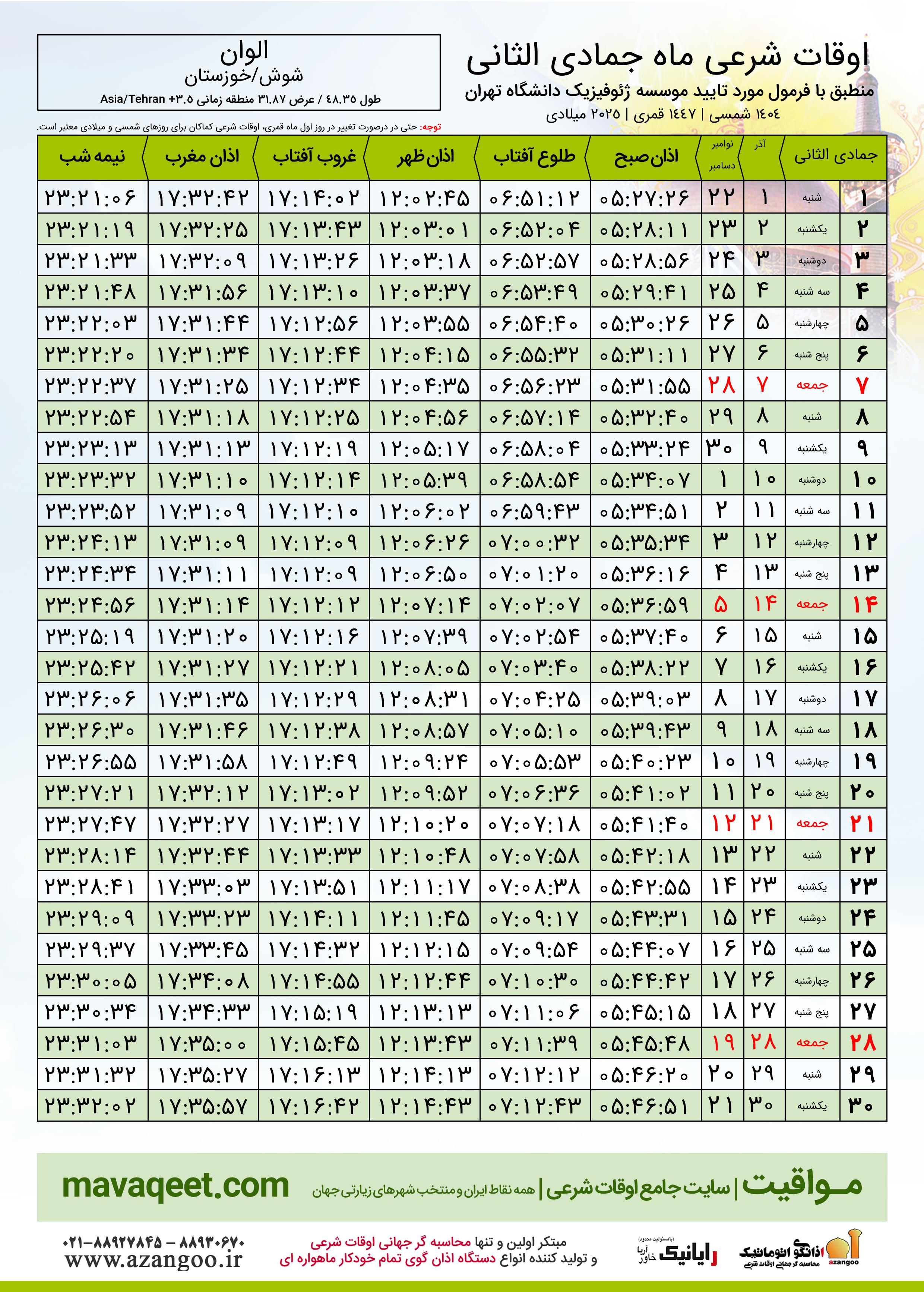 اوقات شرعی ماه جمادی الثانی ١٤٤٧ هـ.ق شهر الوان بر