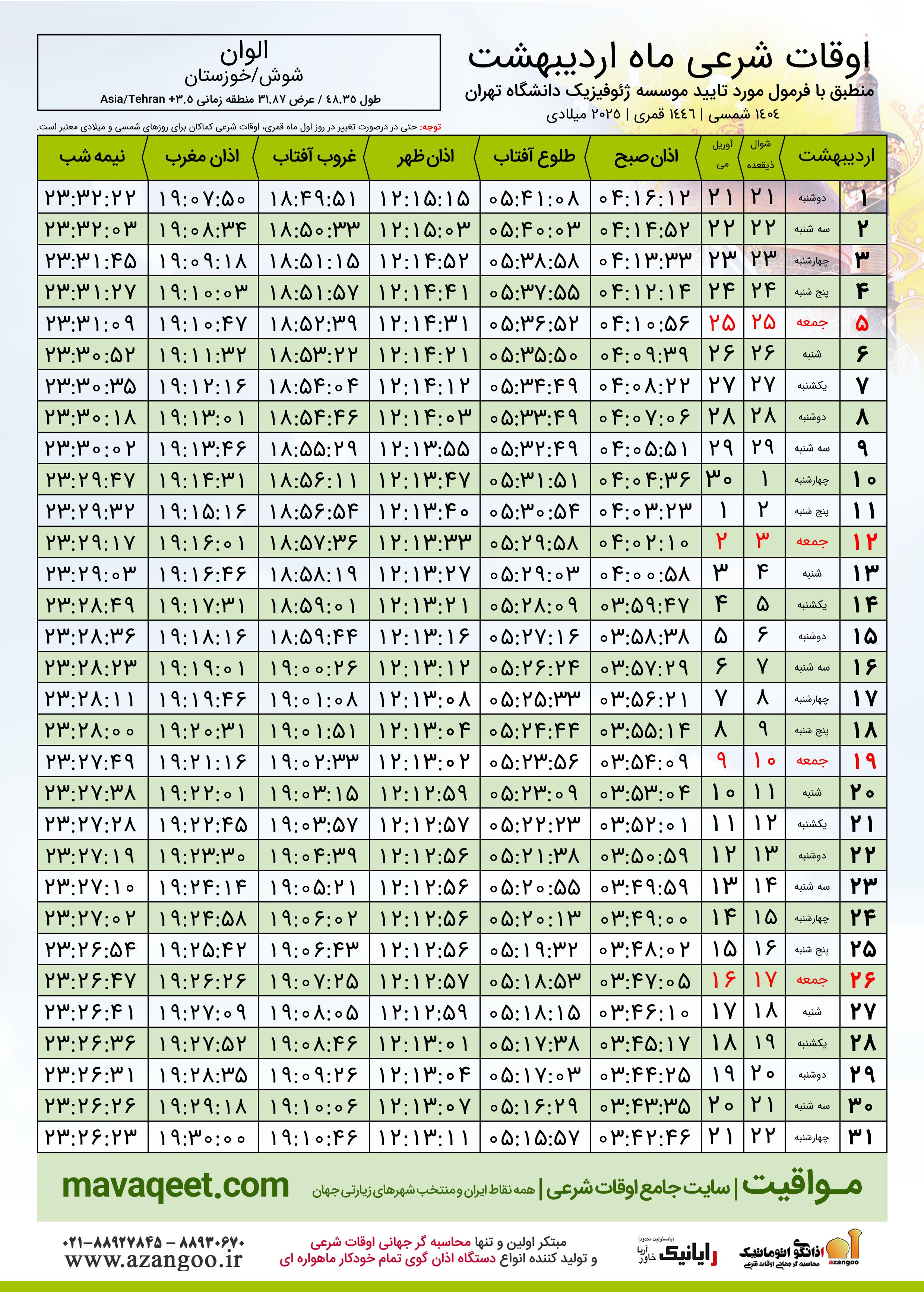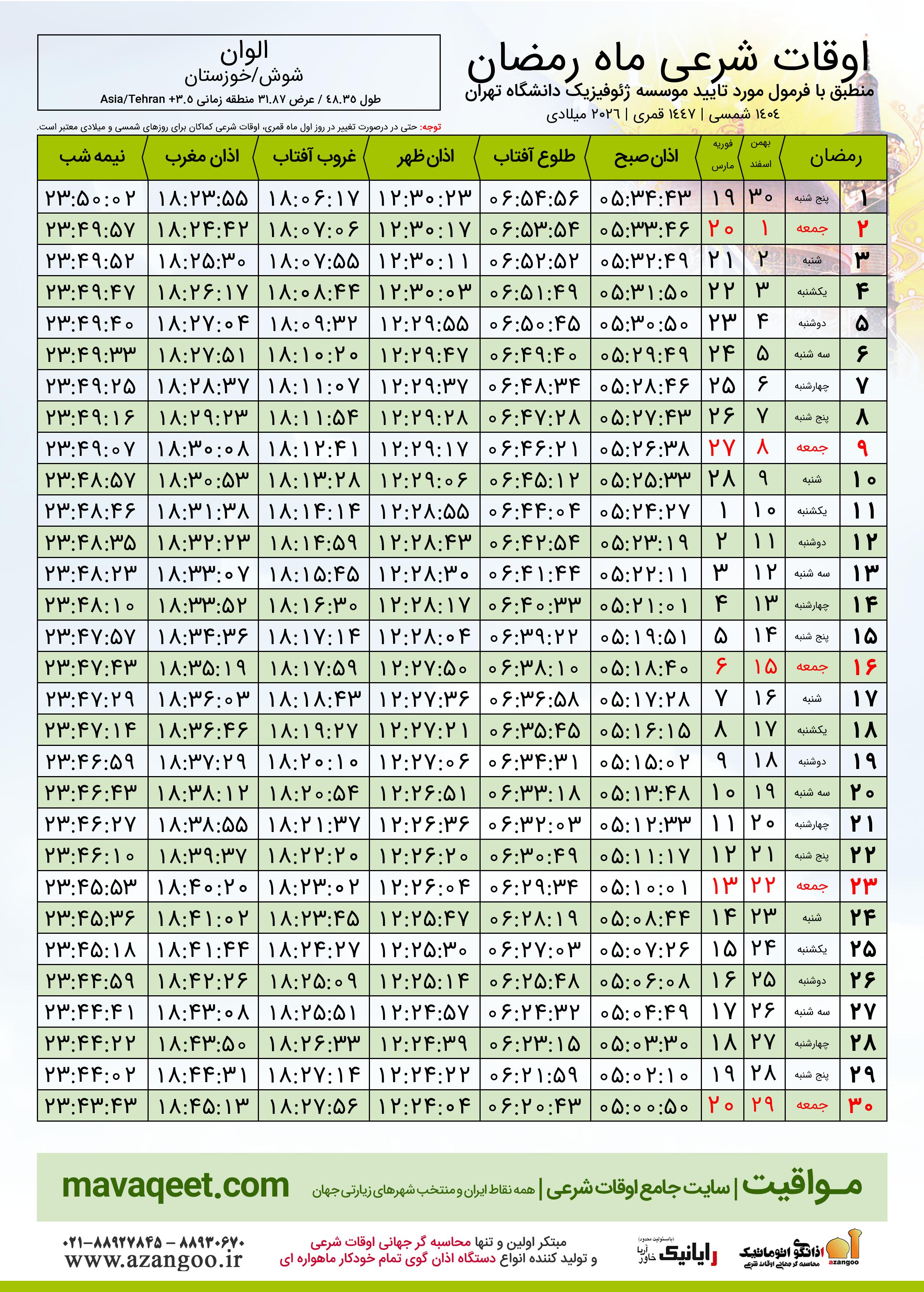 جدول اوقات شرعی ماه رمضان شهر الوان ٠٤ - ١٤٠٤ شمسی | ٢٠٢٦ میلادی | ١٤٤٧ قمری