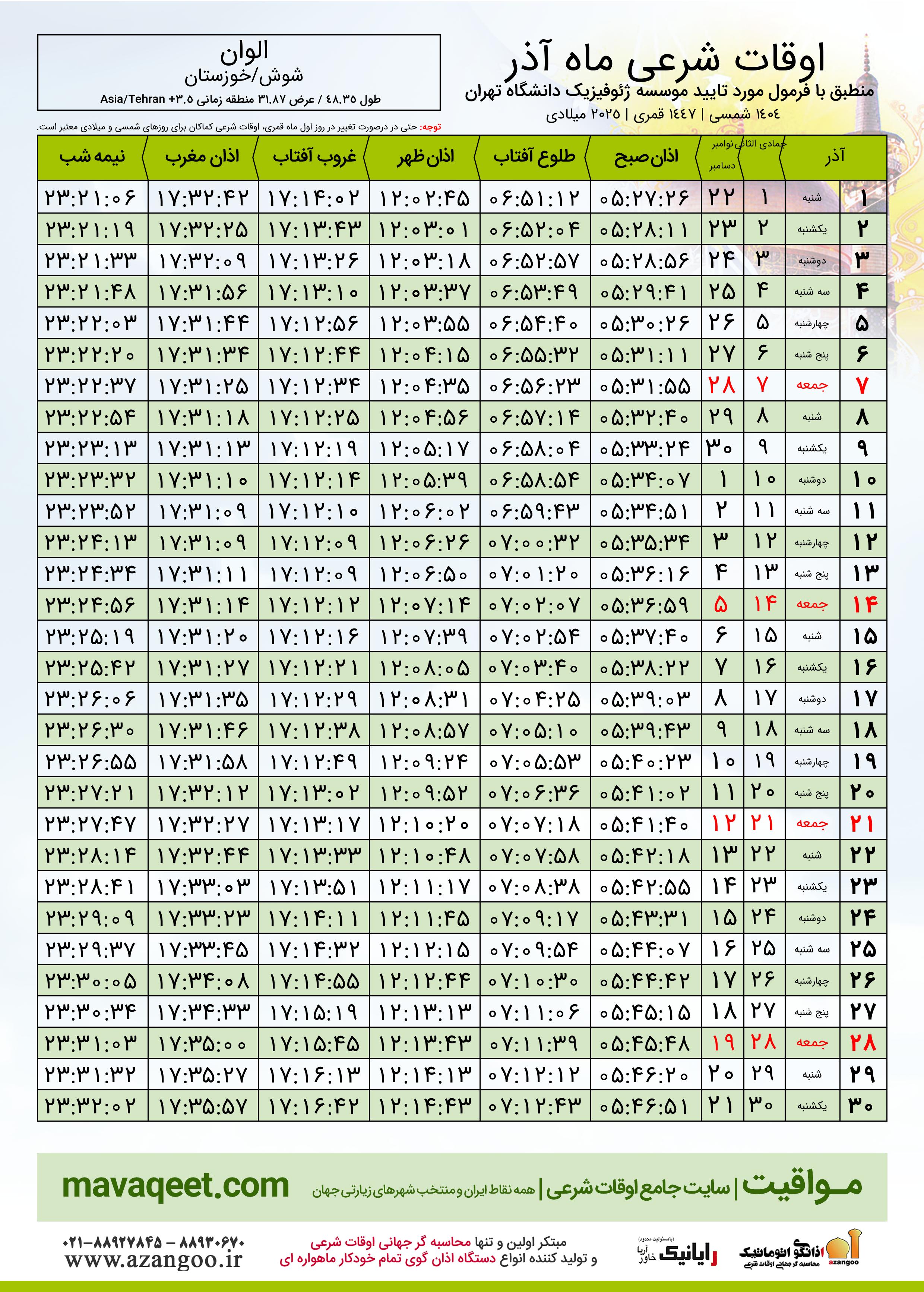 جهت نمایش تصویر جدول اوقات شرعی جدول اوقات شرعی آذر ١٤٠٤ شمسی شهر الوان شهر الوان در اندازه