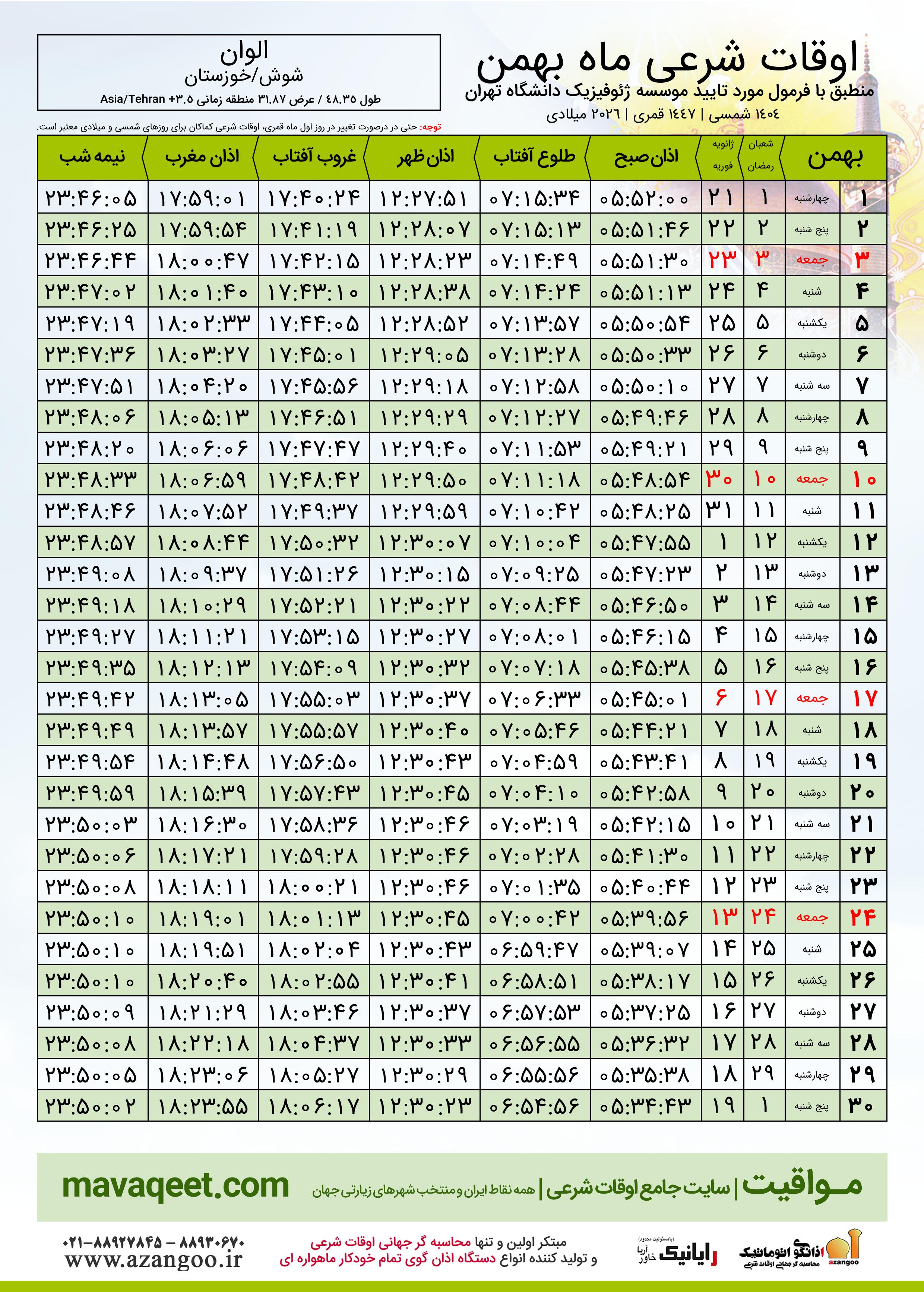 دانلود اوقات شرعی بهمن ٠٤ - ١٤٠٤ شهر الوان