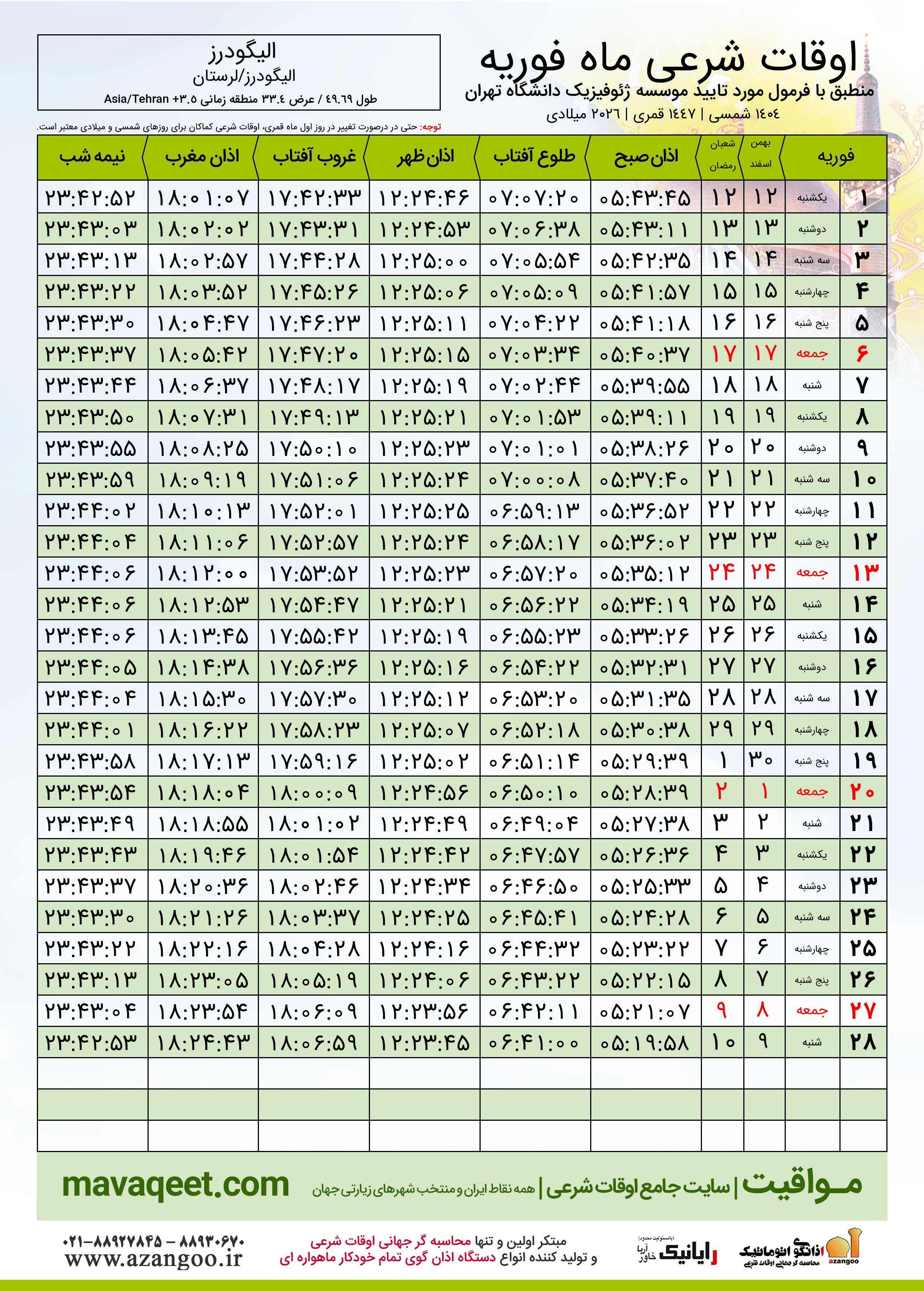اوقات شرعی فوریه ٢٠٢٦ شهر الیگودرز + دانلود