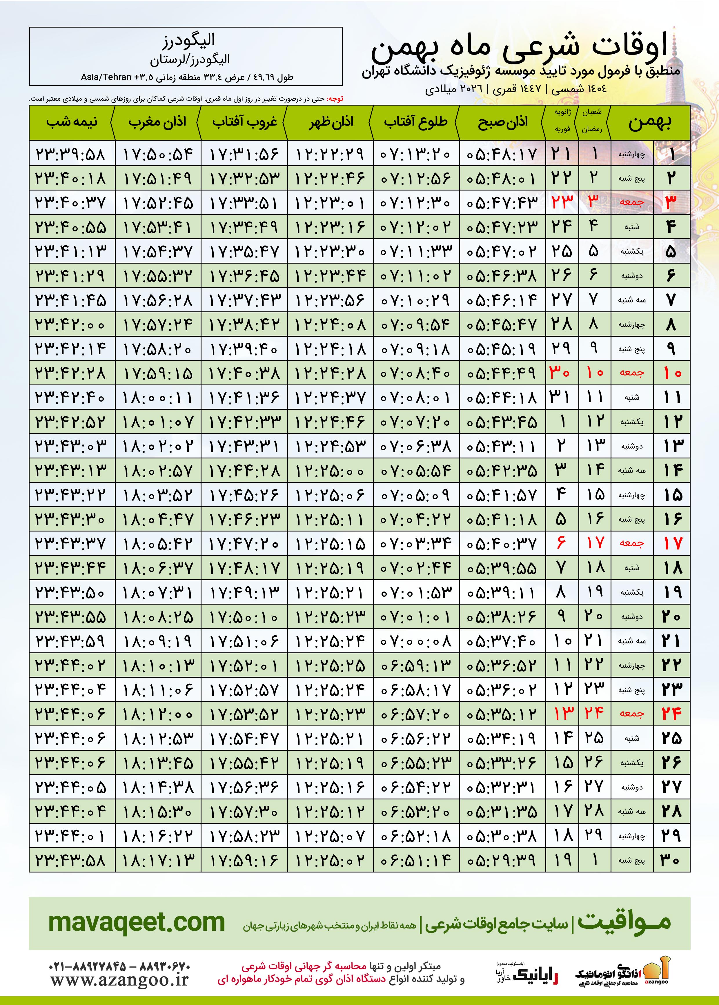 دانلود اوقات شرعی بهمن ٠٤ - ١٤٠٤ شهر الیگودرز