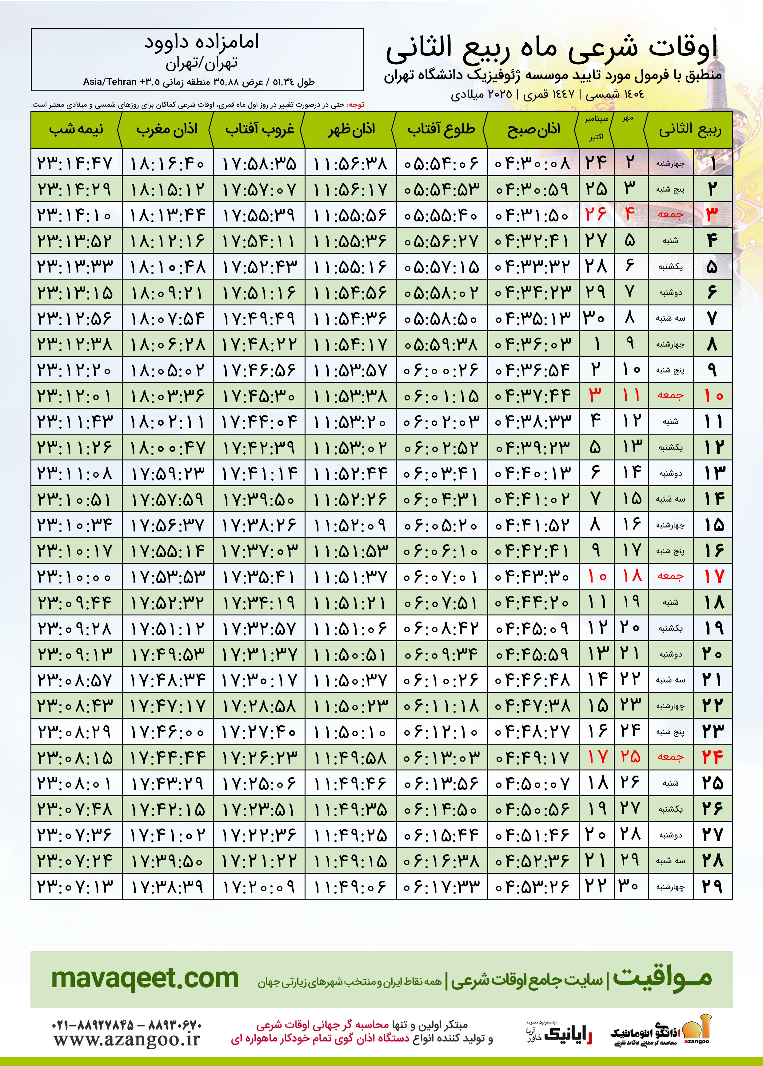 جدول اوقات شرعی ربیع الثانی ١٤٤٧ قمری شهر امامزاده داوود