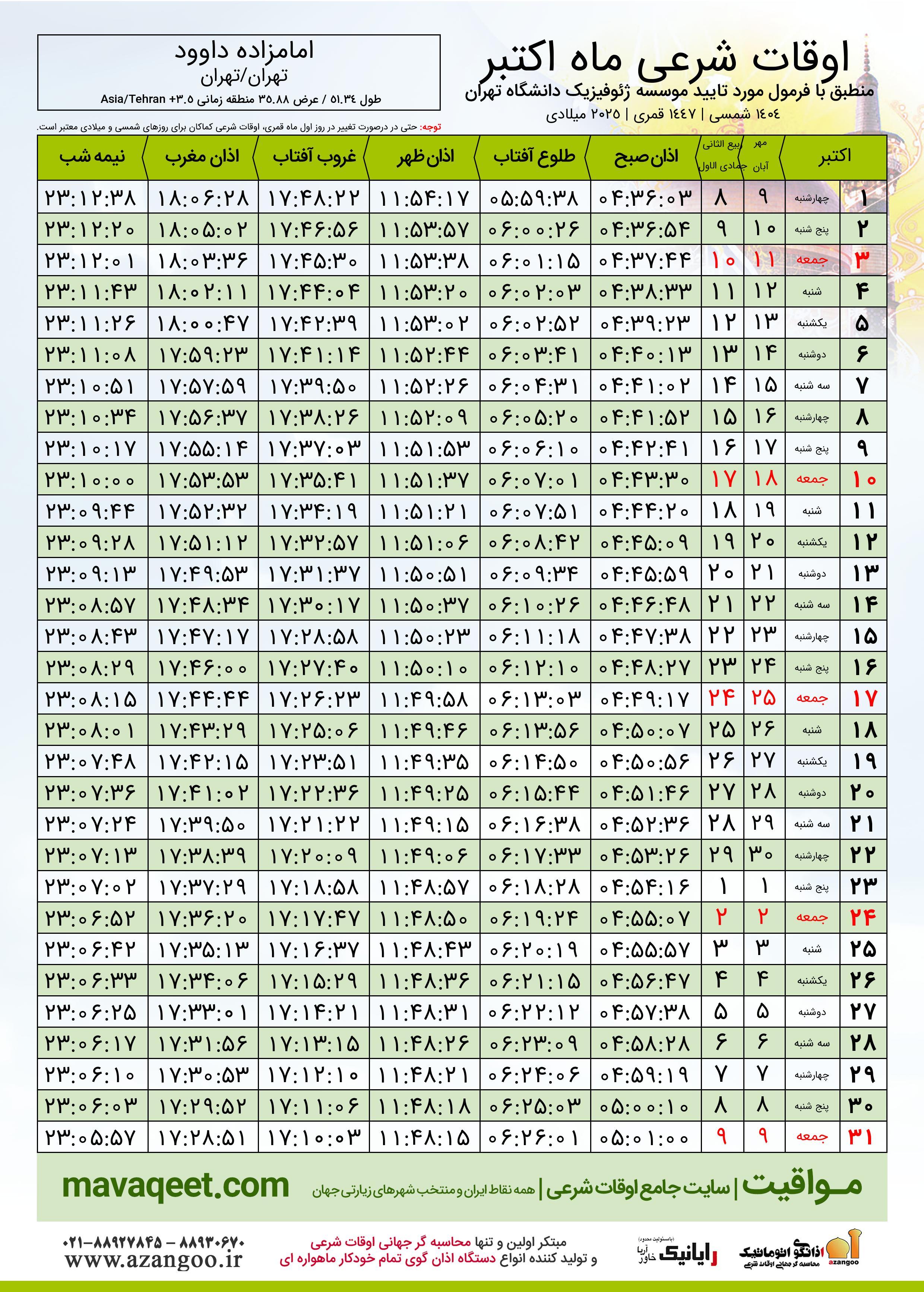 جدول اوقات شرعی اکتبر ٢٠٢٥ میلادی شهر امامزاده داوود