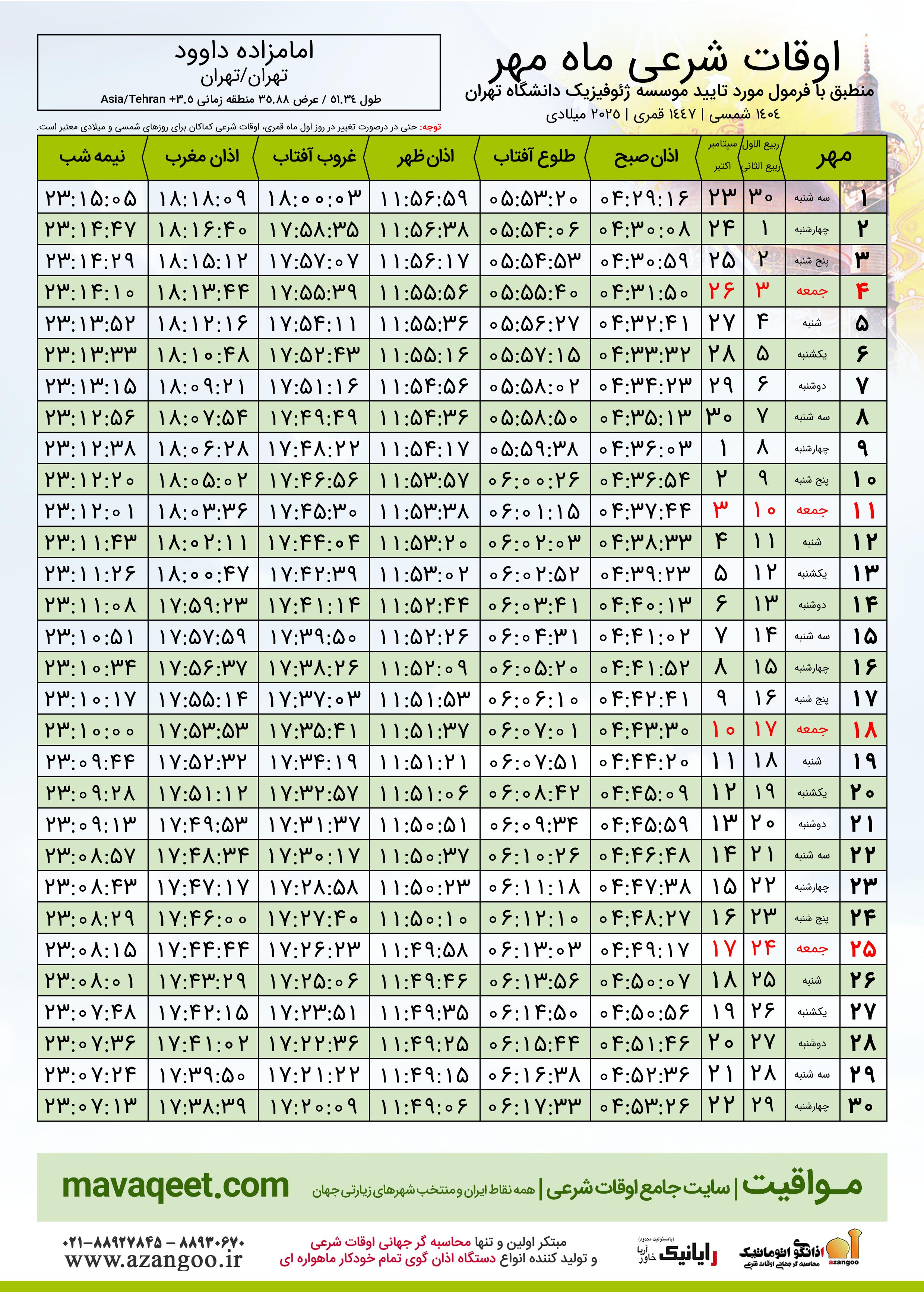 جدول اوقات شرعی مهر ١٤٠٤ شمسی شهر امامزاده داوود