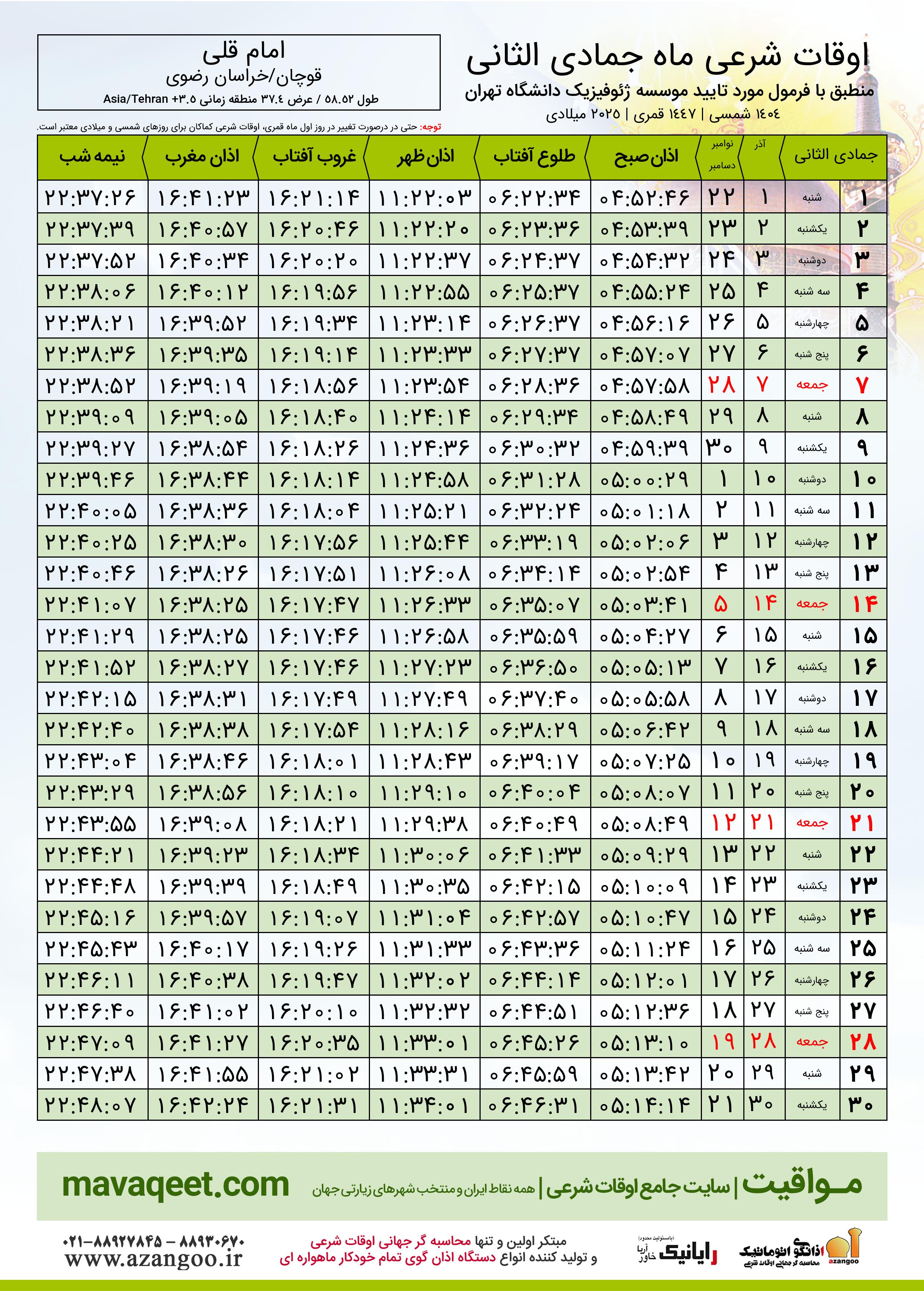 اوقات شرعی ماه جمادی الثانی ١٤٤٧ هـ.ق شهر امام قلی بر
