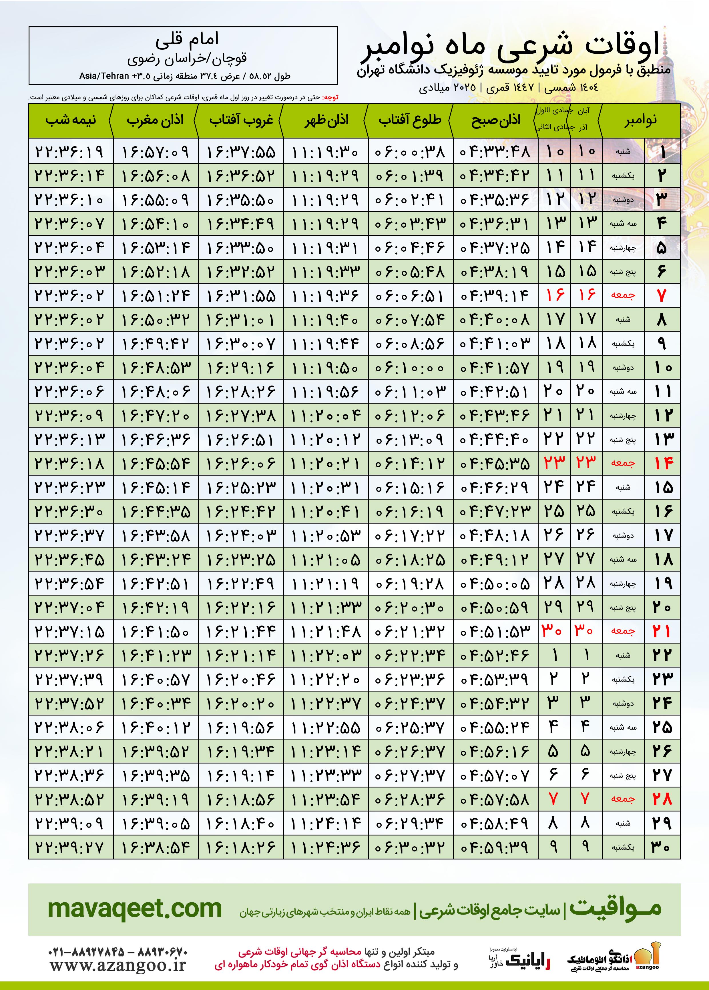 دانلود اوقات شرعی ماه رمضان ٠٤ - ١٤٠٤ شمسی | ٢٠٢٦ میلادی | ١٤٤٧ قمری شهر امام قلی