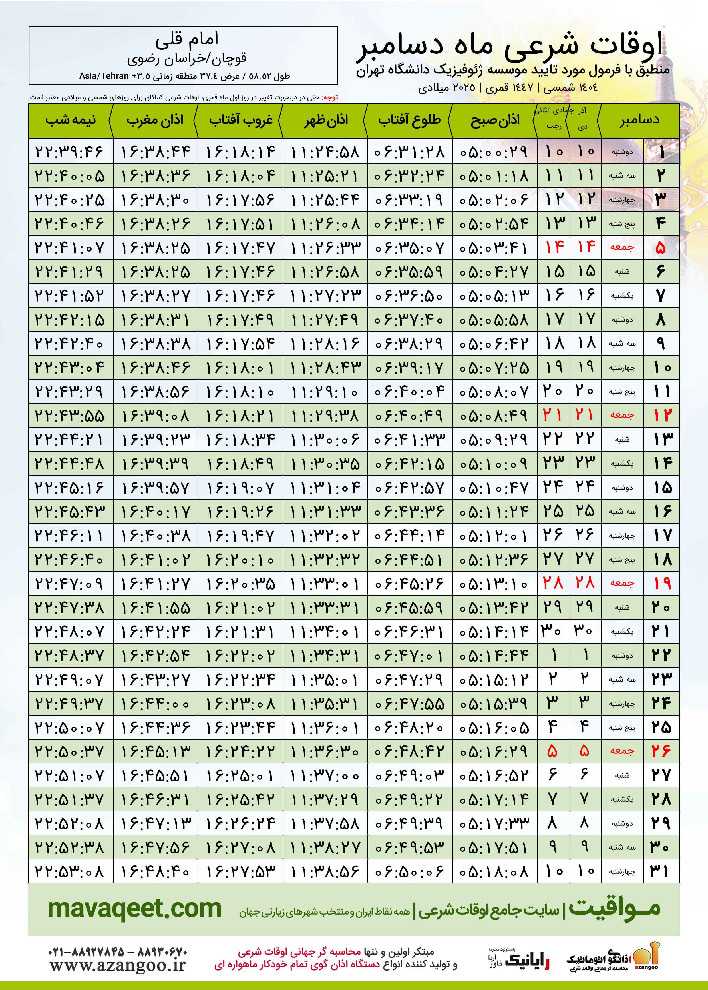 جدول اوقات شرعی دسامبر ٢٠٢٥ میلادی شهر امام قلی