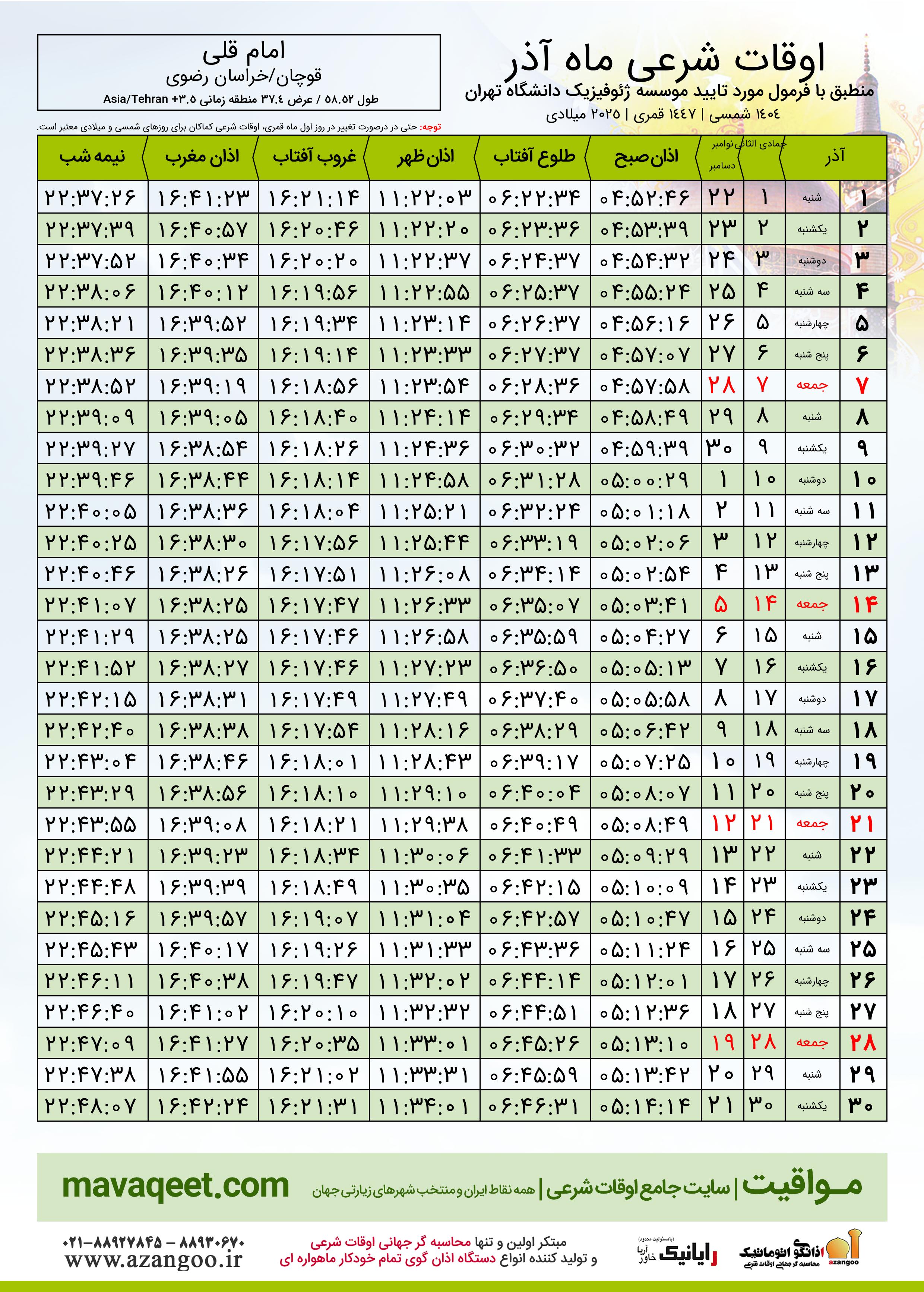 اوقات شرعی آذر ١٤٠٤ شمسی شهر امام قلی