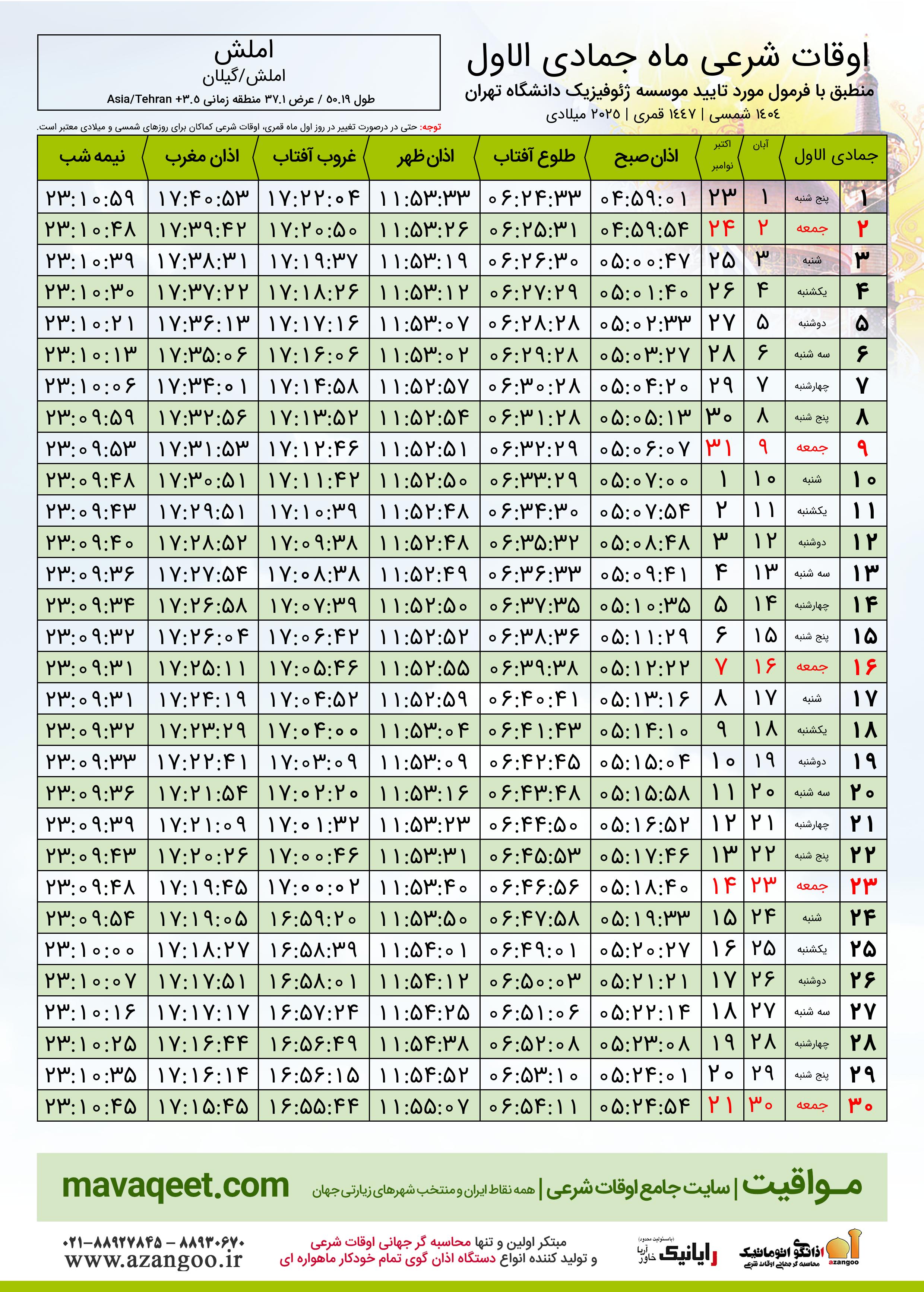 اوقات شرعی ماه جمادی الاول ١٤٤٧ هـ.ق شهر املش بر