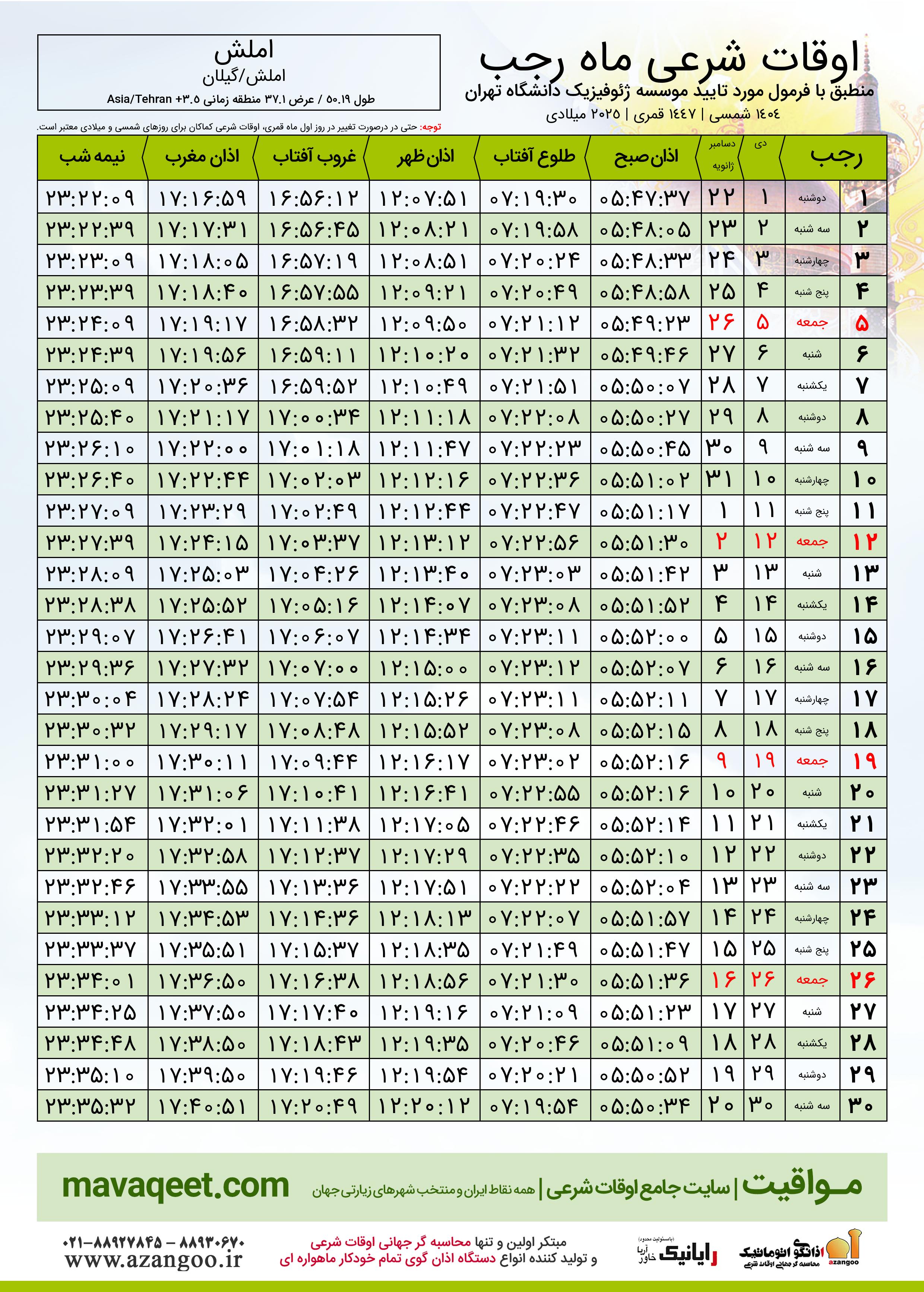 اوقات شرعی ماه رجب ١٤٤٧ هـ.ق شهر املش بر