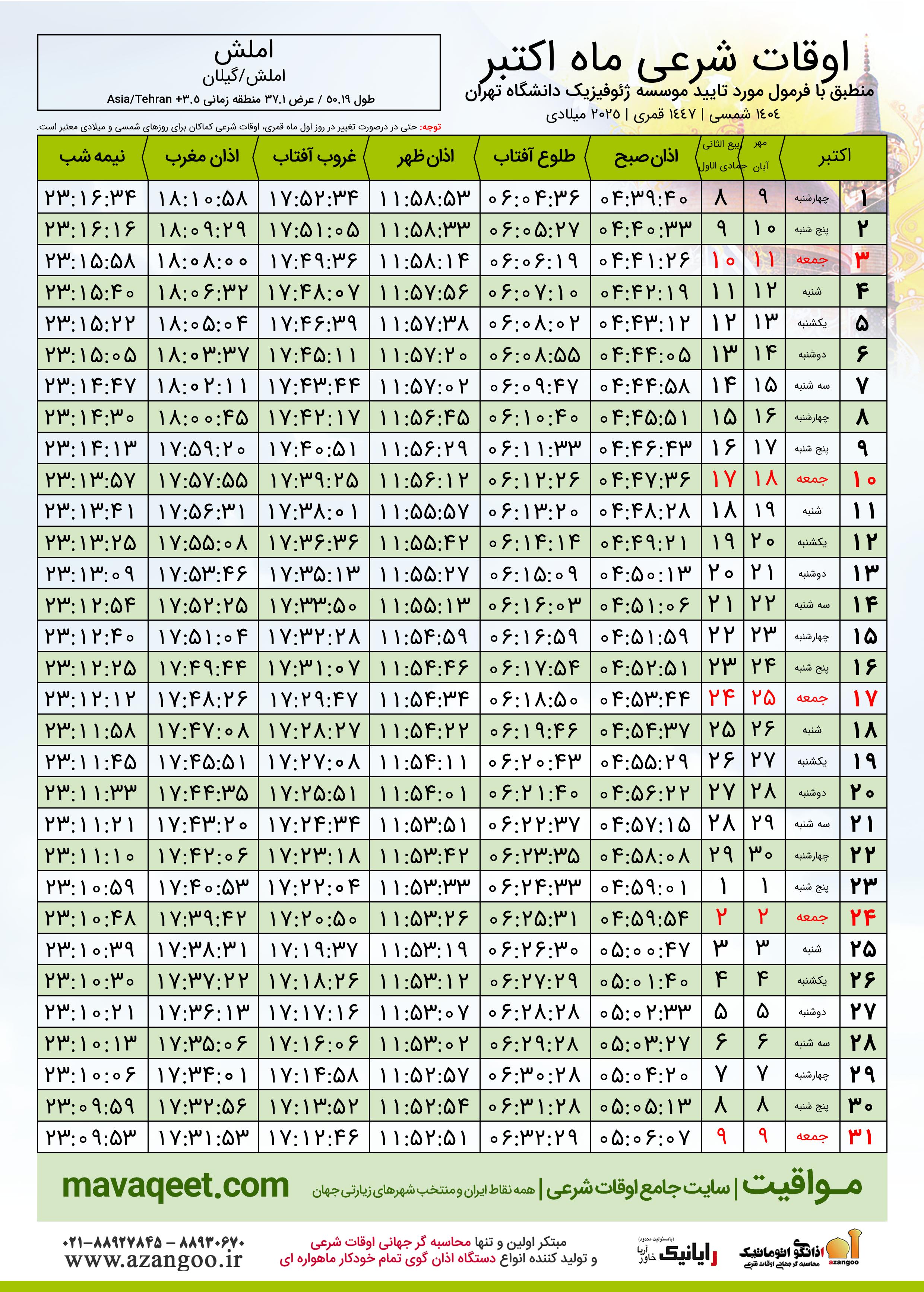جهت نمایش تصویر جدول اوقات شرعی جدول اوقات شرعی اکتبر ٢٠٢٥ میلادی شهر املش شهر املش در اندازه