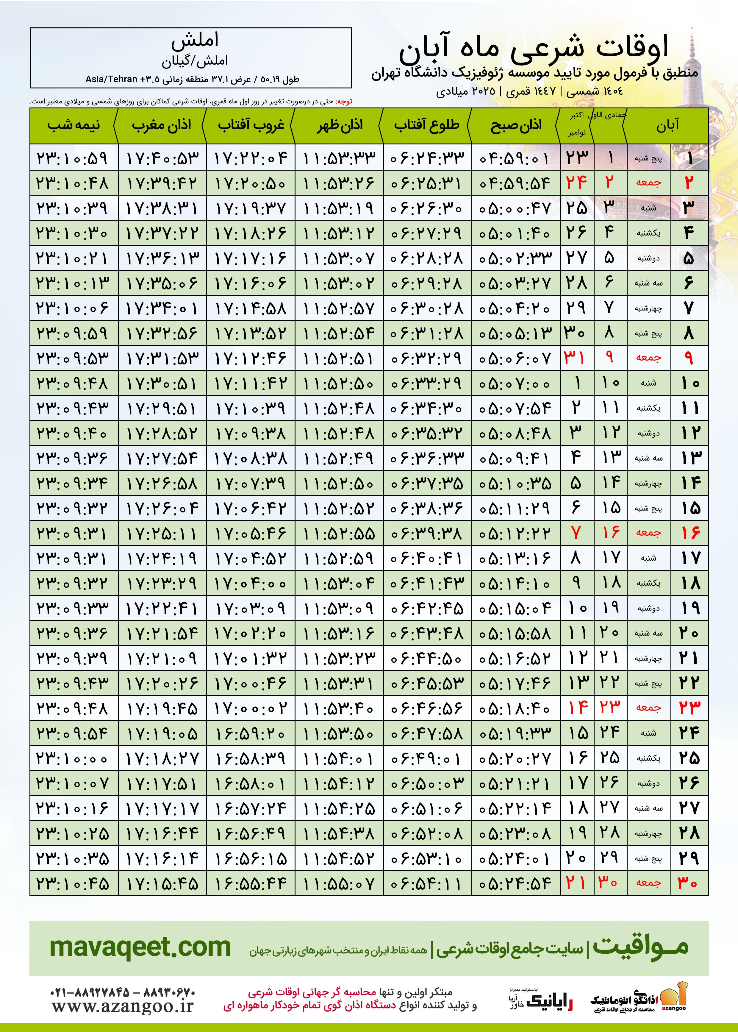 دانلود اوقات شرعی آبان ٠٤ - ١٤٠٤ شهر املش