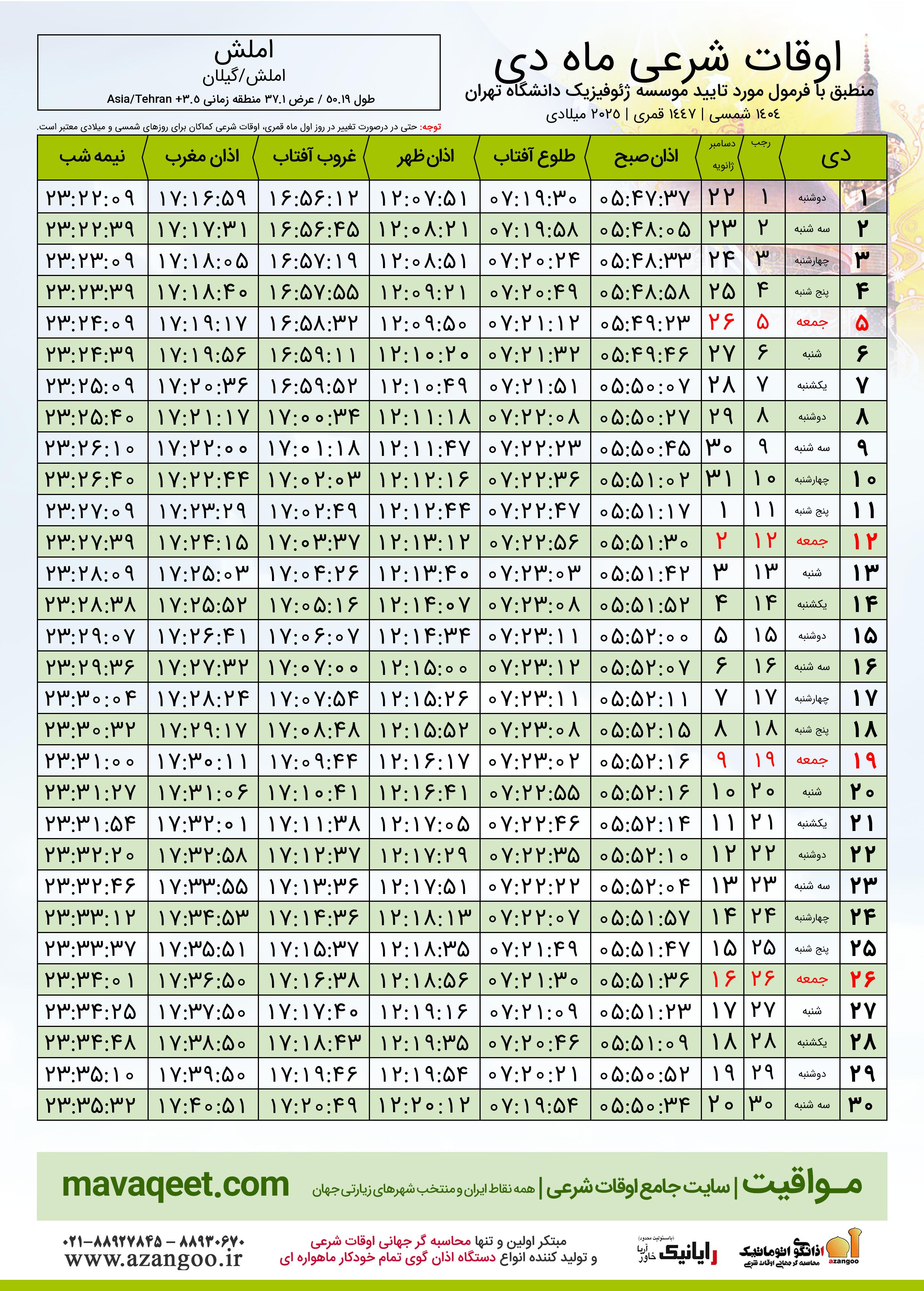 دانلود اوقات شرعی دی ٠٤ - ١٤٠٤ شهر املش