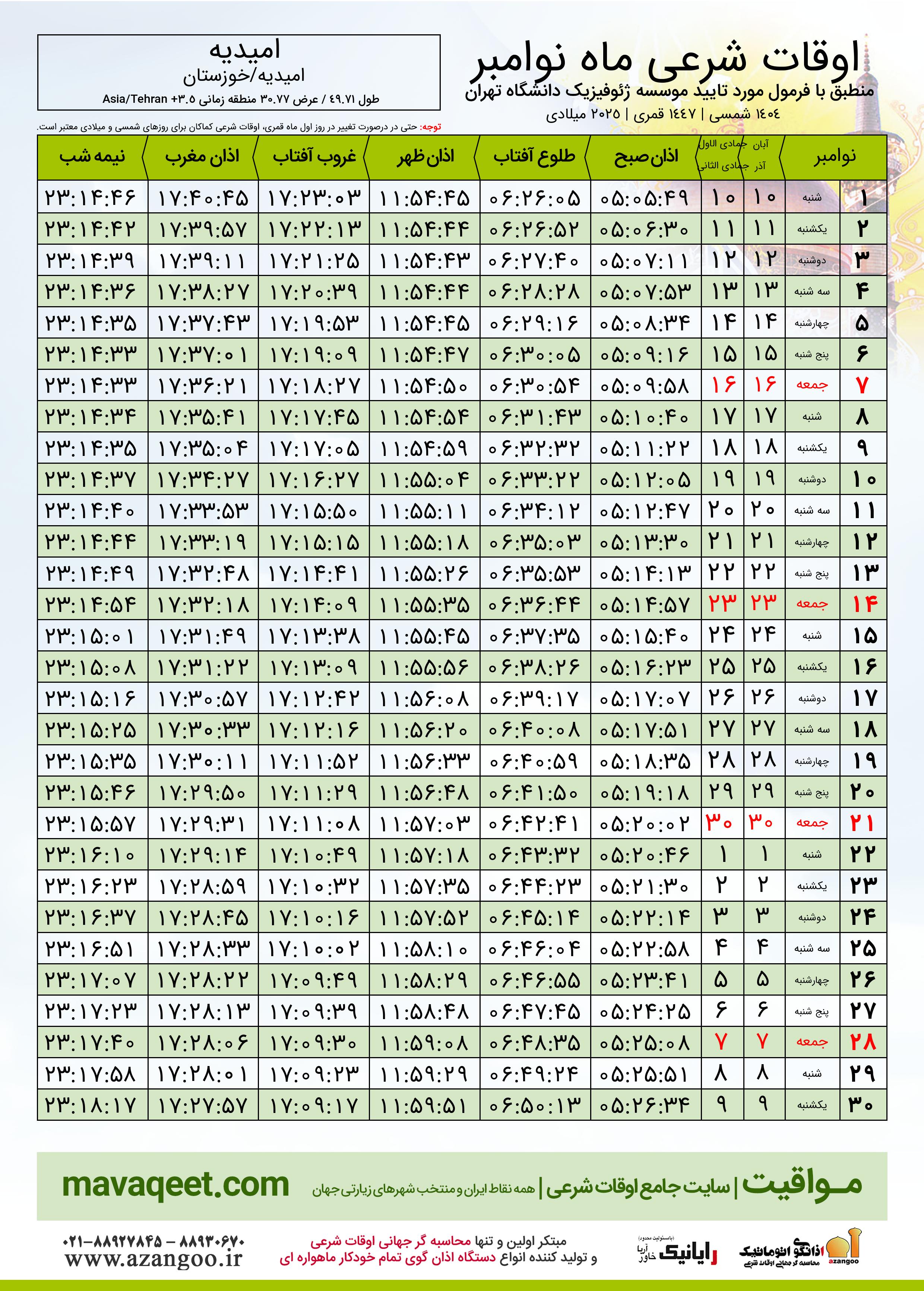 جدول اوقات شرعی نوامبر ٢٠٢٥ میلادی شهر امیدیه