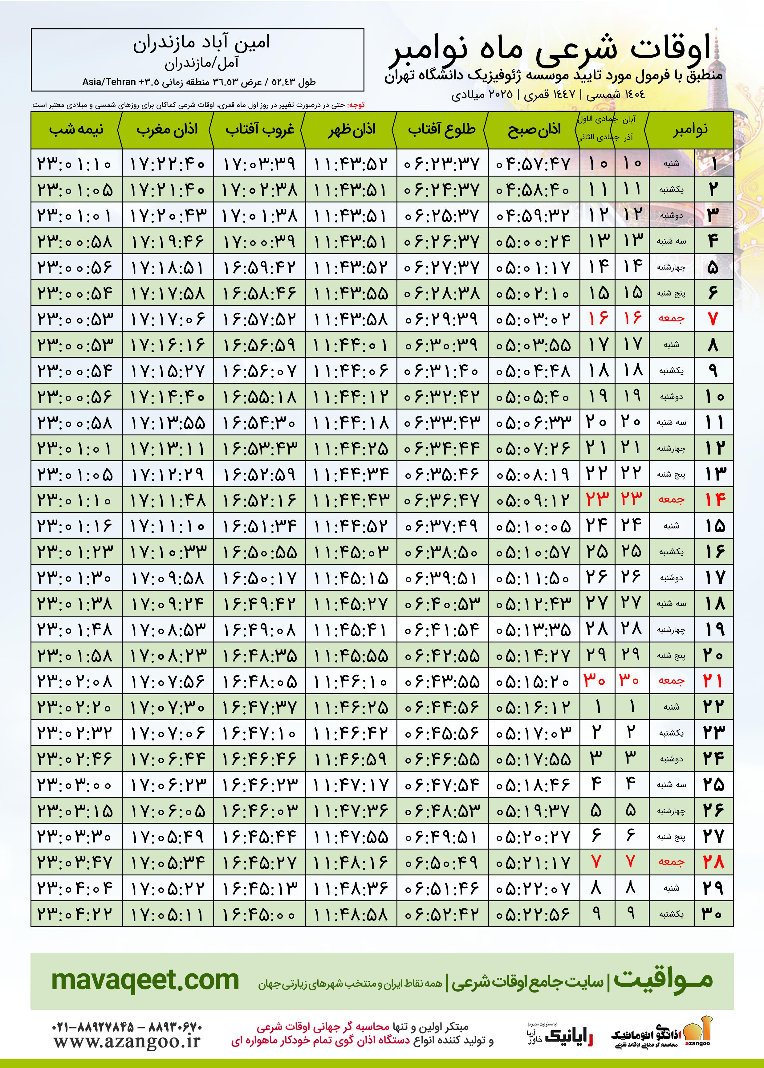 اوقات شرعی نوامبر ٢٠٢٥ میلادی شهر امین آباد مازندران