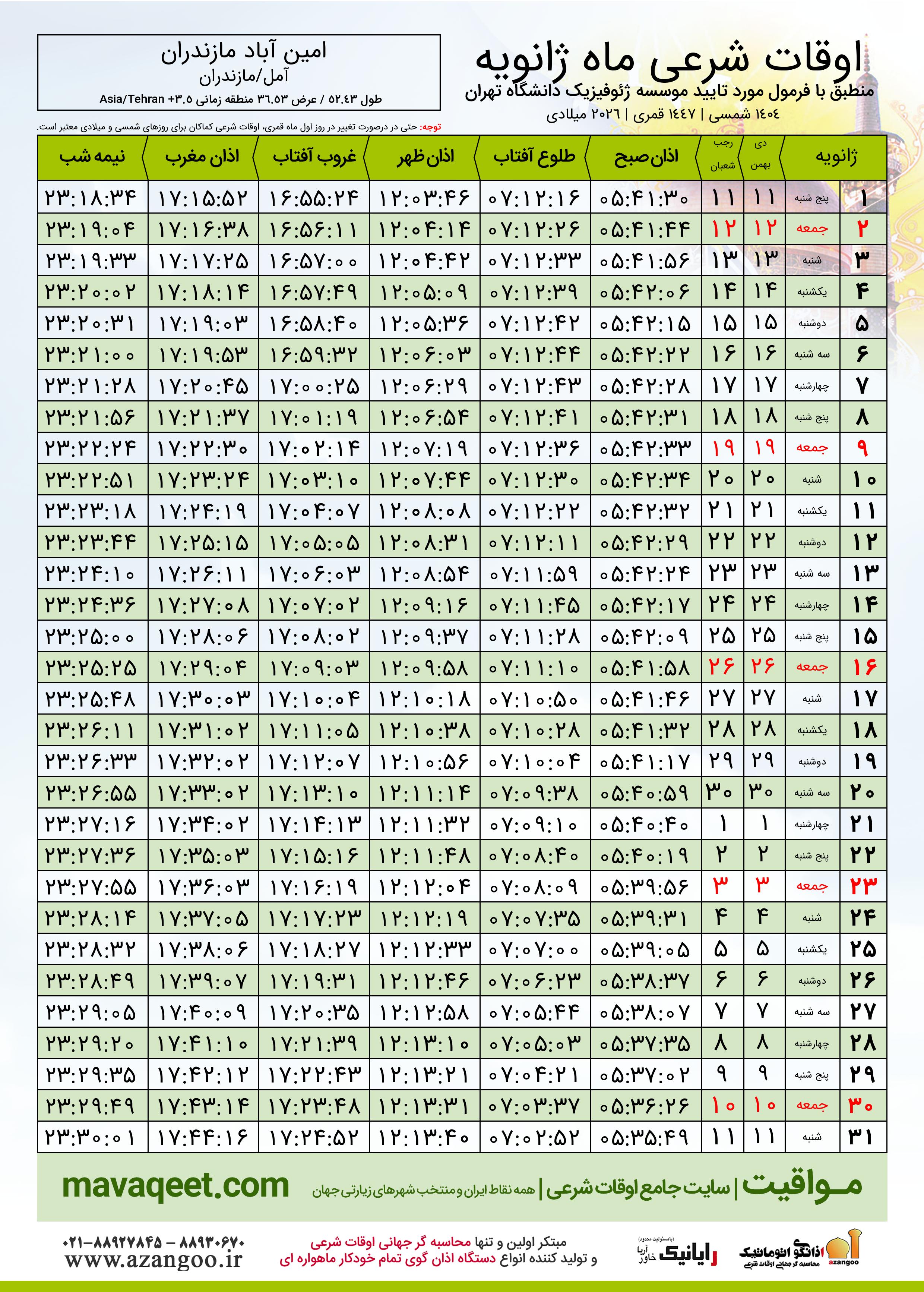 اوقات شرعی ماه رجب ١٤٤٧ هـ.ق شهر امین آباد مازندران بر