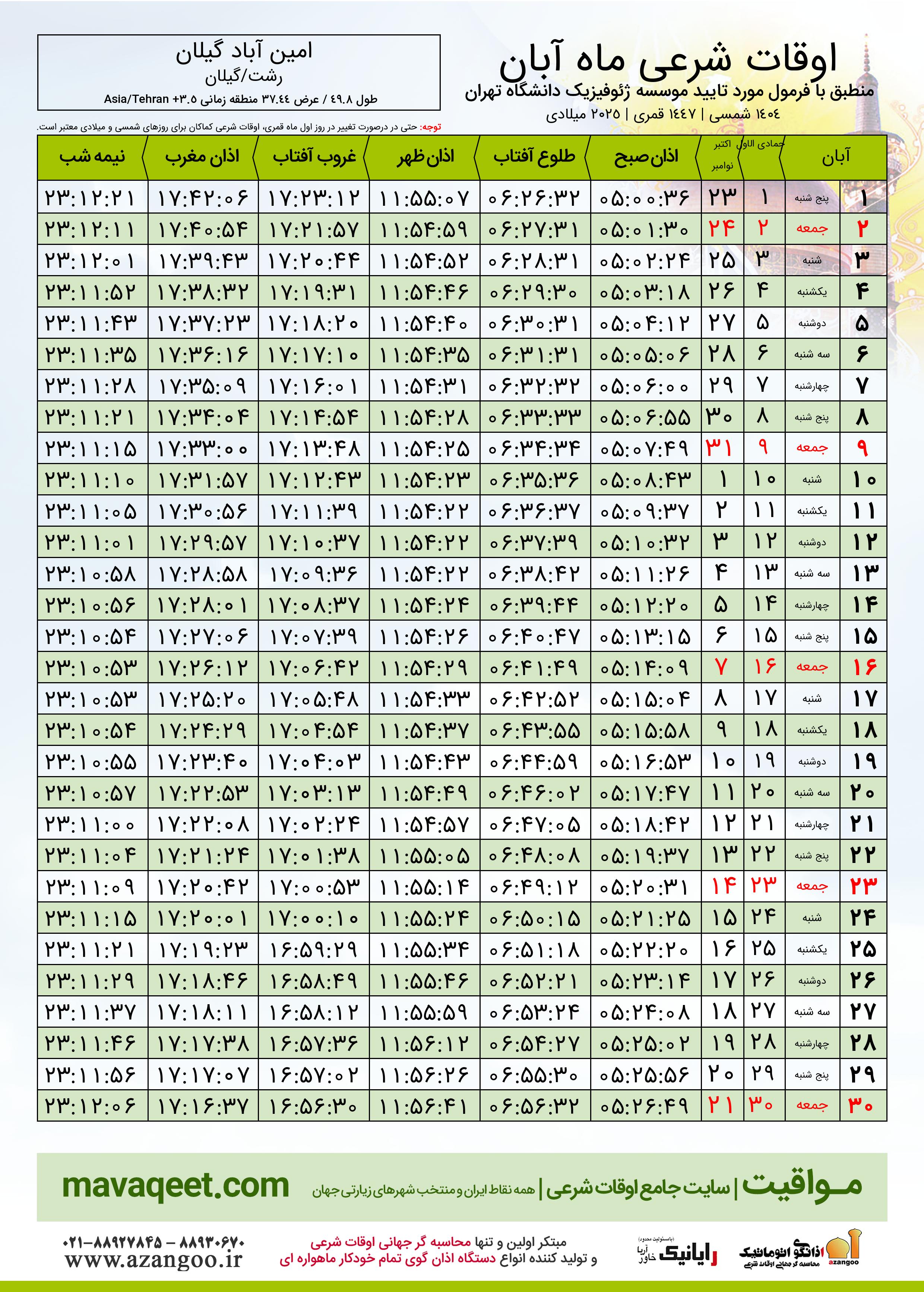جدول اوقات شرعی آبان ١٤٠٤ شمسی شهر امین آباد گیلان