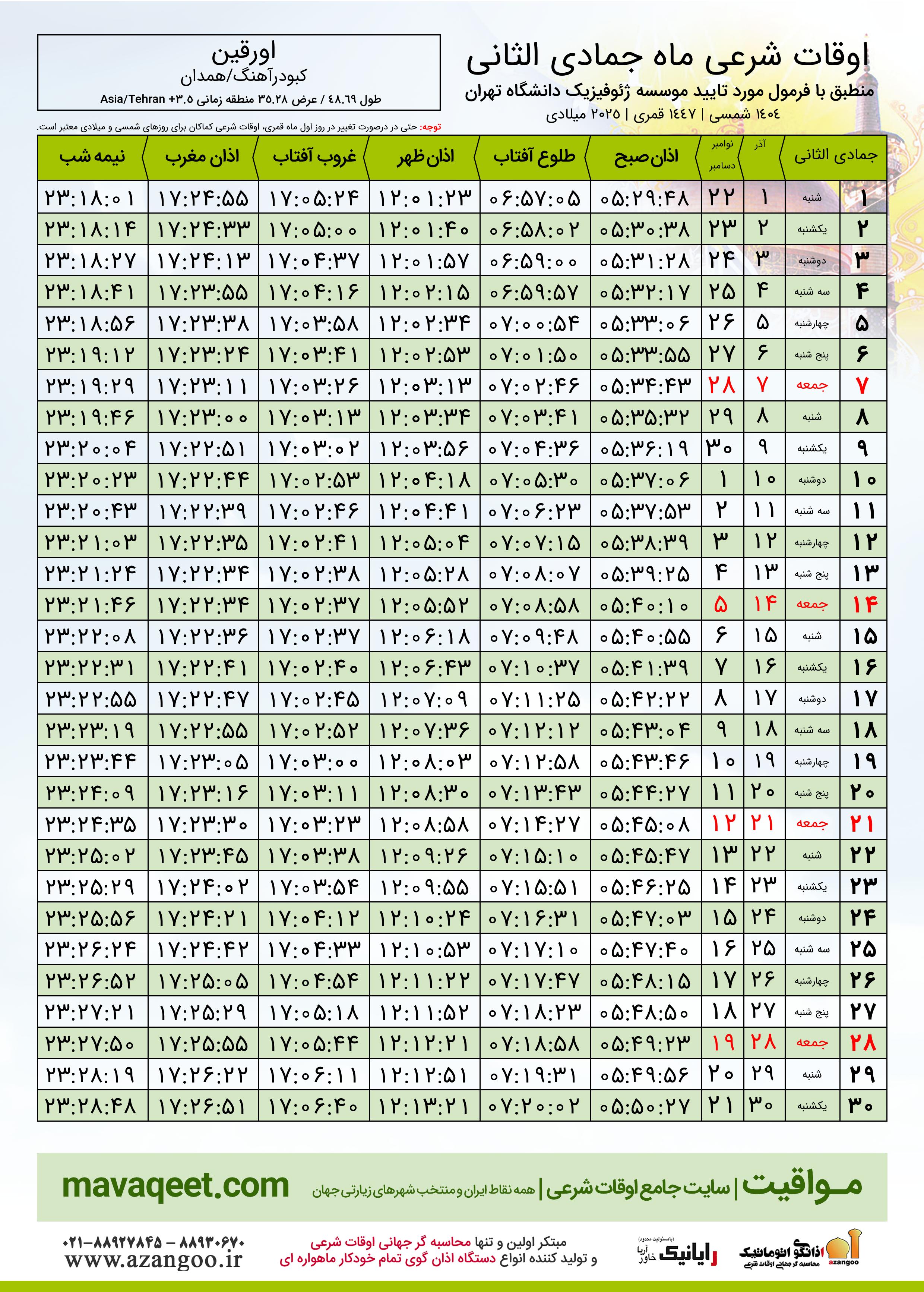 اوقات شرعی ماه جمادی الثانی ١٤٤٧ هـ.ق شهر اورقین بر