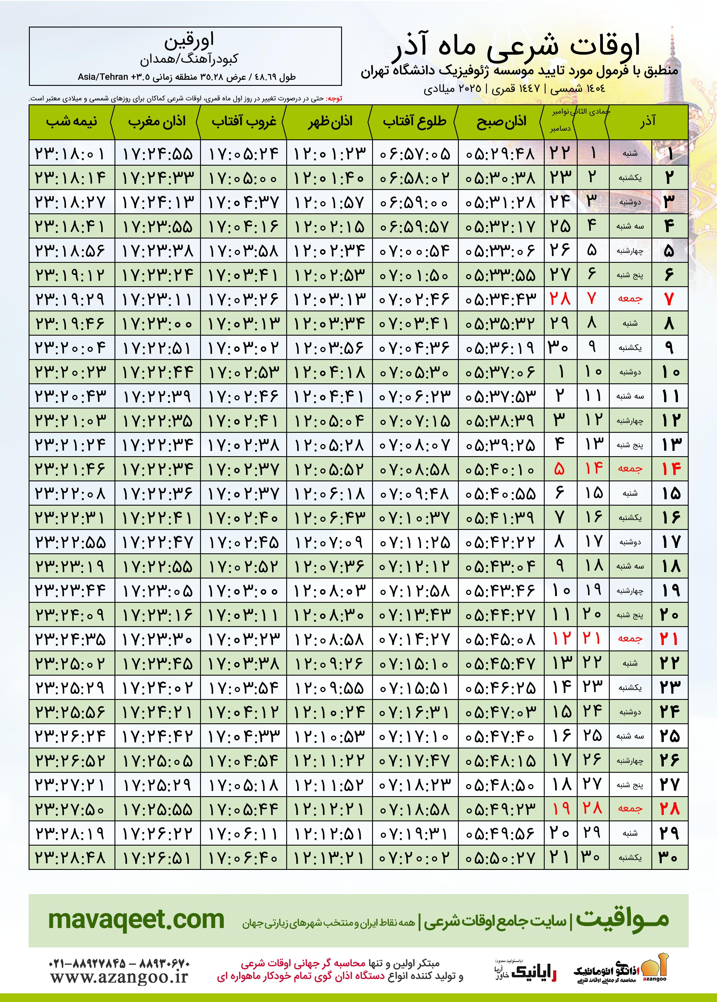 جدول اوقات شرعی آذر ١٤٠٤ شمسی شهر اورقین
