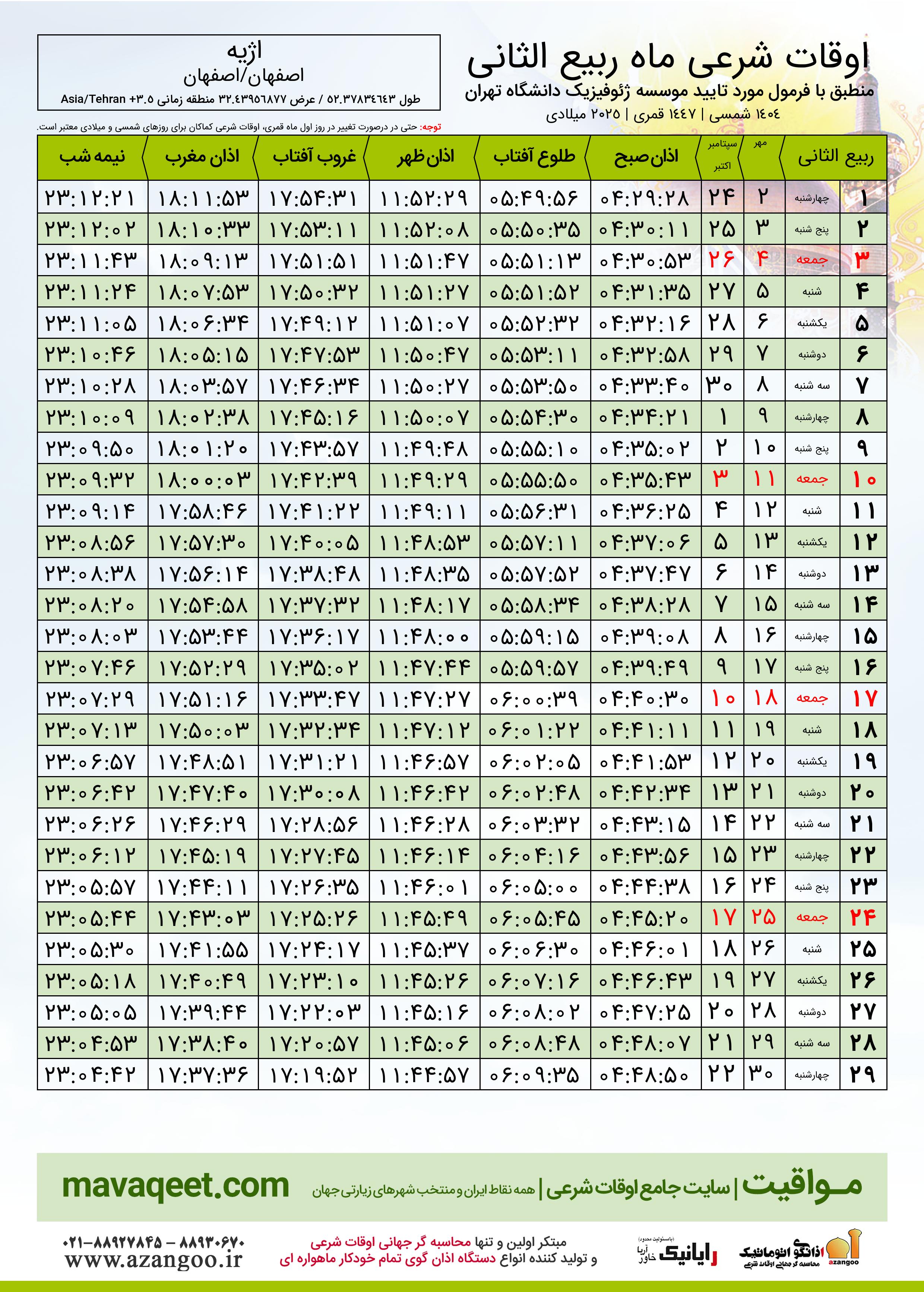 دانلود اوقات شرعی ماه ربیع الثانی ١٤٤٧ هـ.ق