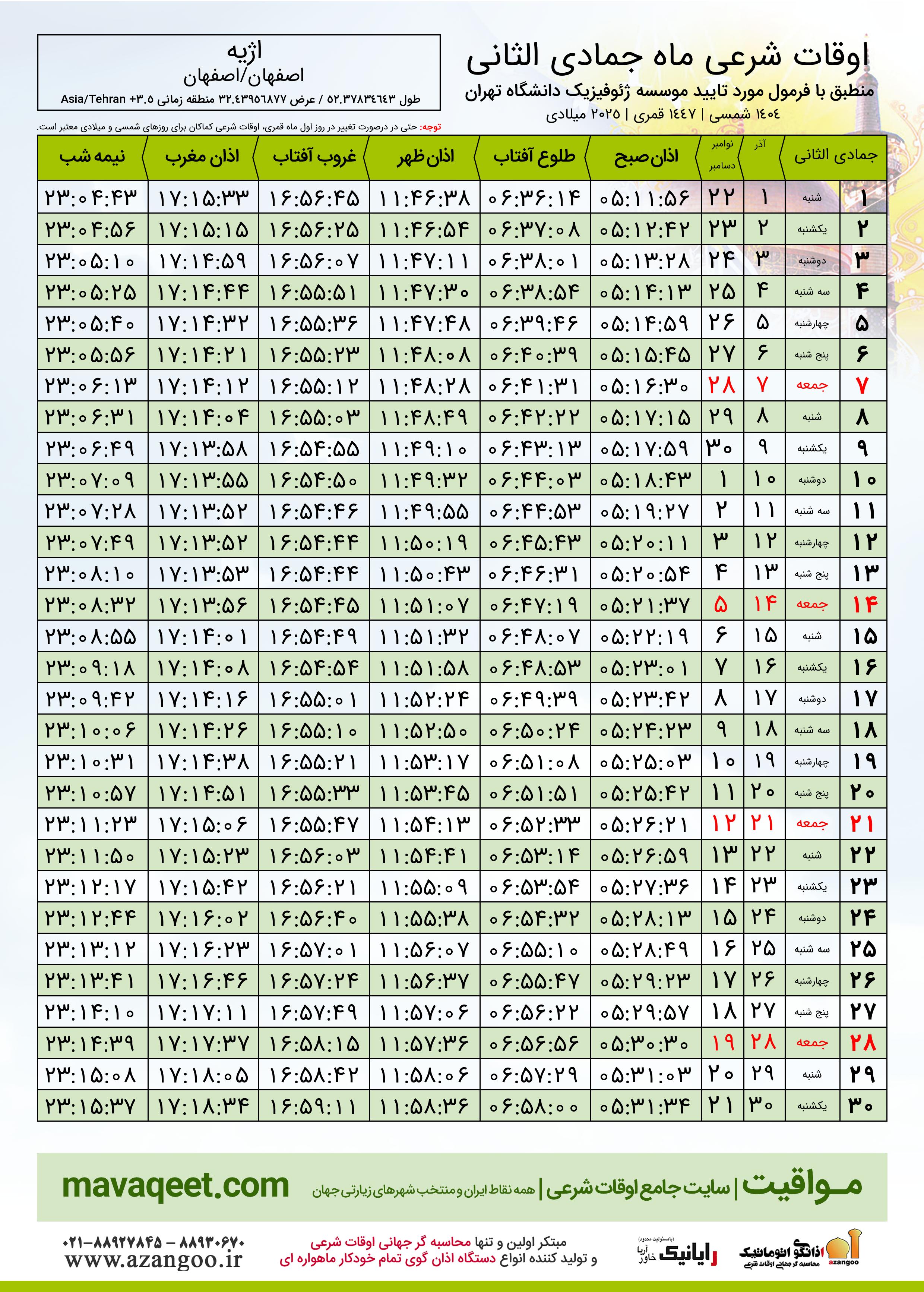 اوقات شرعی ماه جمادی الثانی ١٤٤٧ هـ.ق شهر اژیه بر